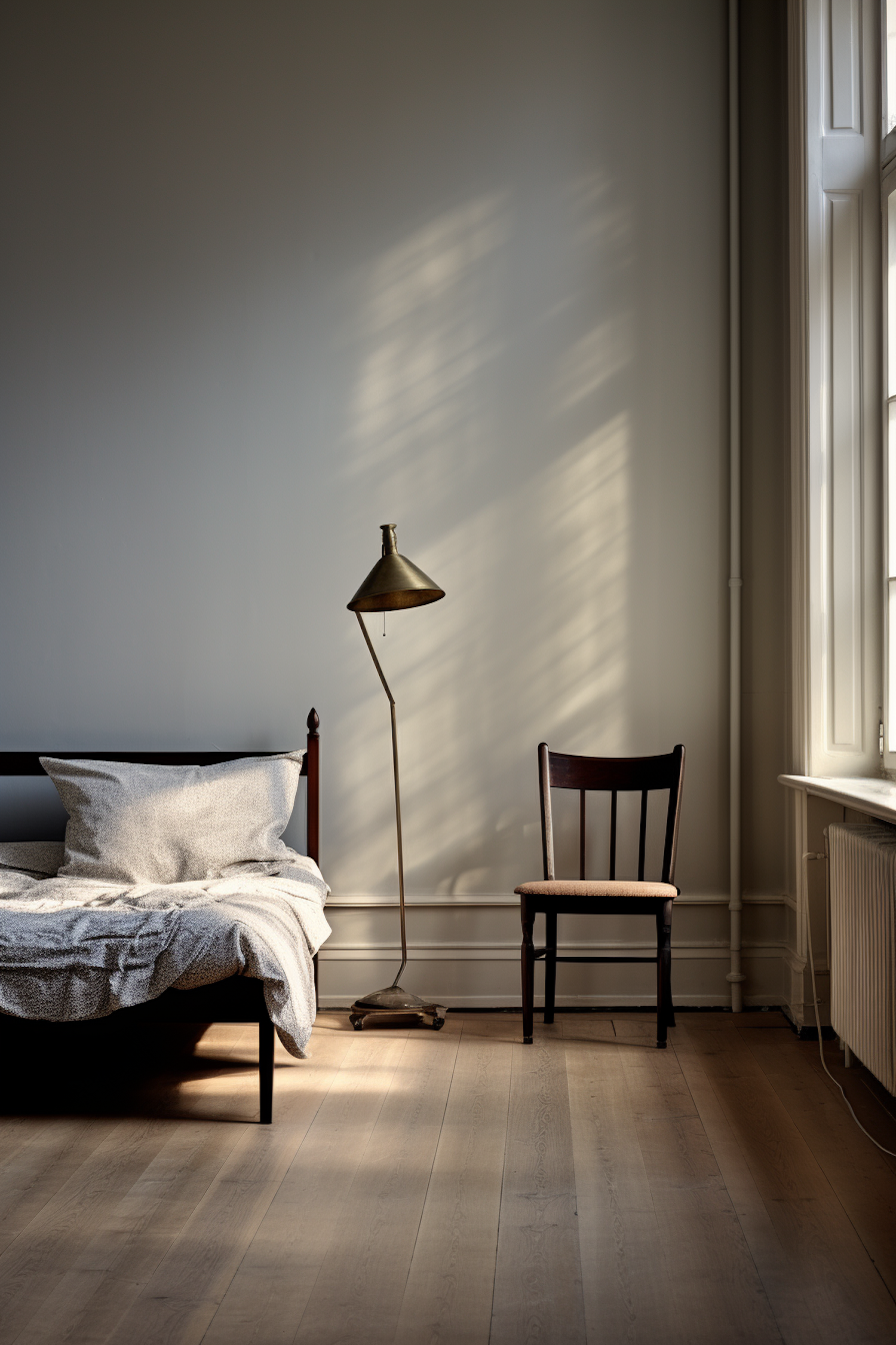 Minimalist bedroom with wooden bed, vintage lamp, and chair in soft natural light. Elegant simplicity and warm tones.