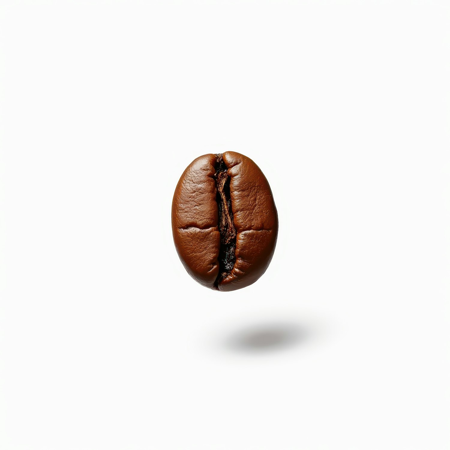 Close-up of a single coffee bean on a white background, showcasing its rich brown color and smooth texture.
