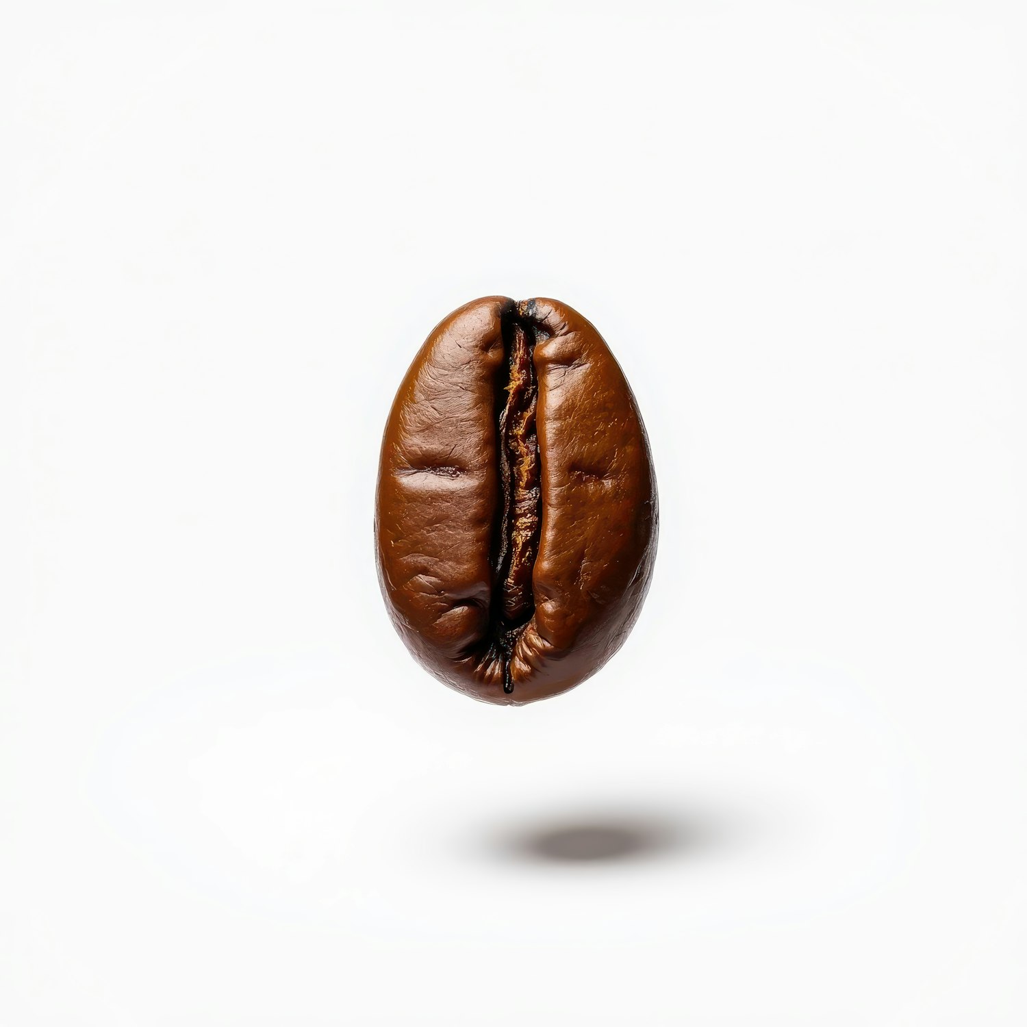 Close-up of a single coffee bean on a white background, highlighting its rich brown color and glossy texture.
