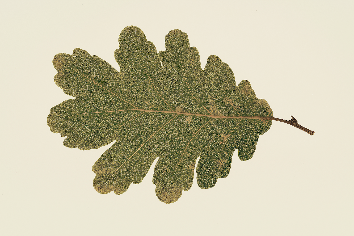 Close-up of a green oak leaf with detailed veins and lobed edges on a light background, showcasing its natural texture.