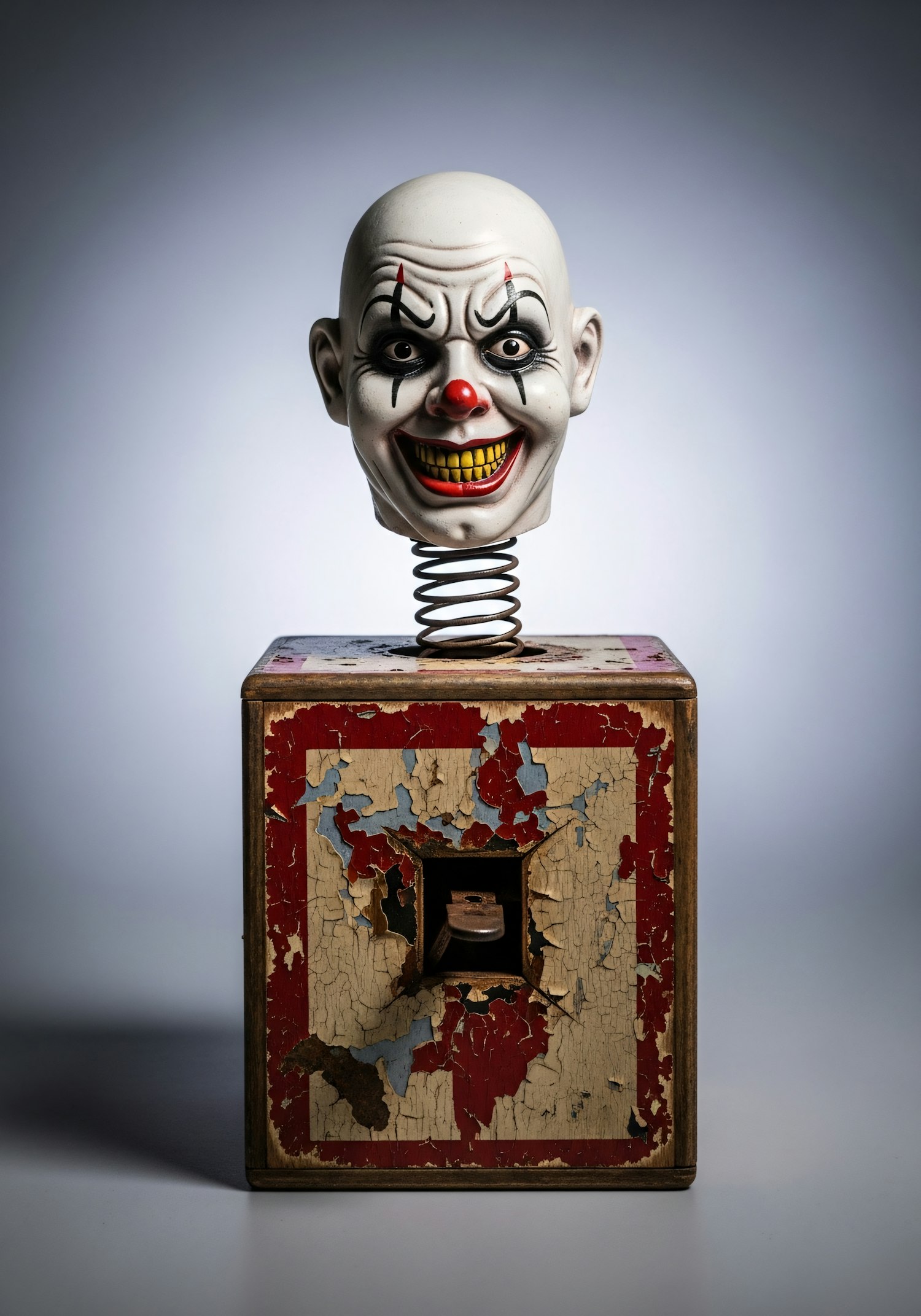 A vintage jack-in-the-box with a sinister clown head and distressed wooden box, creating an eerie and nostalgic atmosphere.