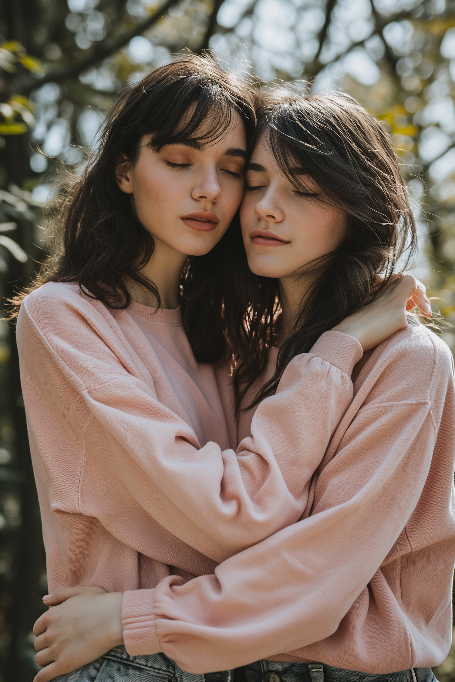 Two young women in pink sweatshirts embrace with eyes closed, surrounded by soft sunlight and greenery, conveying peace and connection.