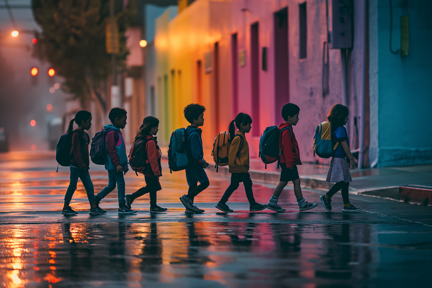 Children with backpacks walk along a colorful street, reflecting vibrant hues on a wet day. A whimsical and serene urban scene.