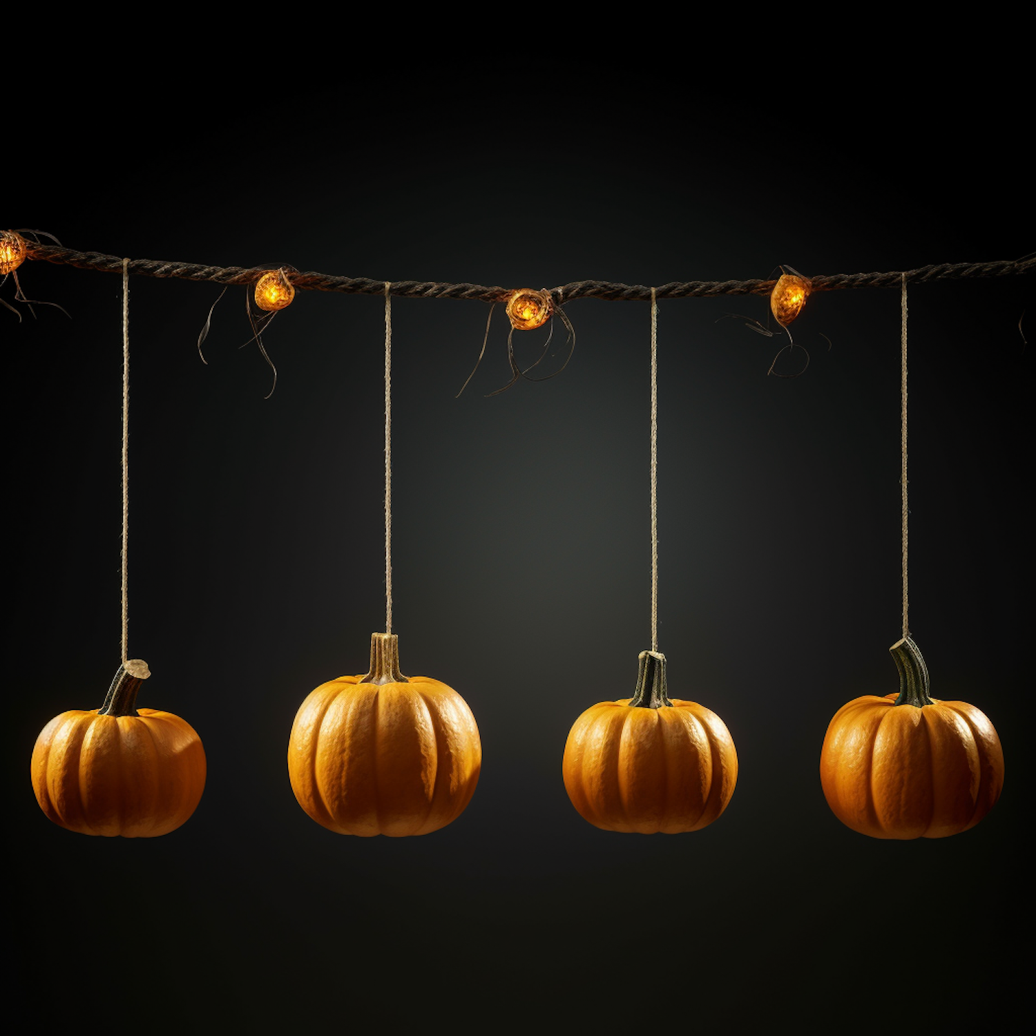 Four small pumpkins hang from a rope with glowing lights, creating a festive and cozy autumn display.