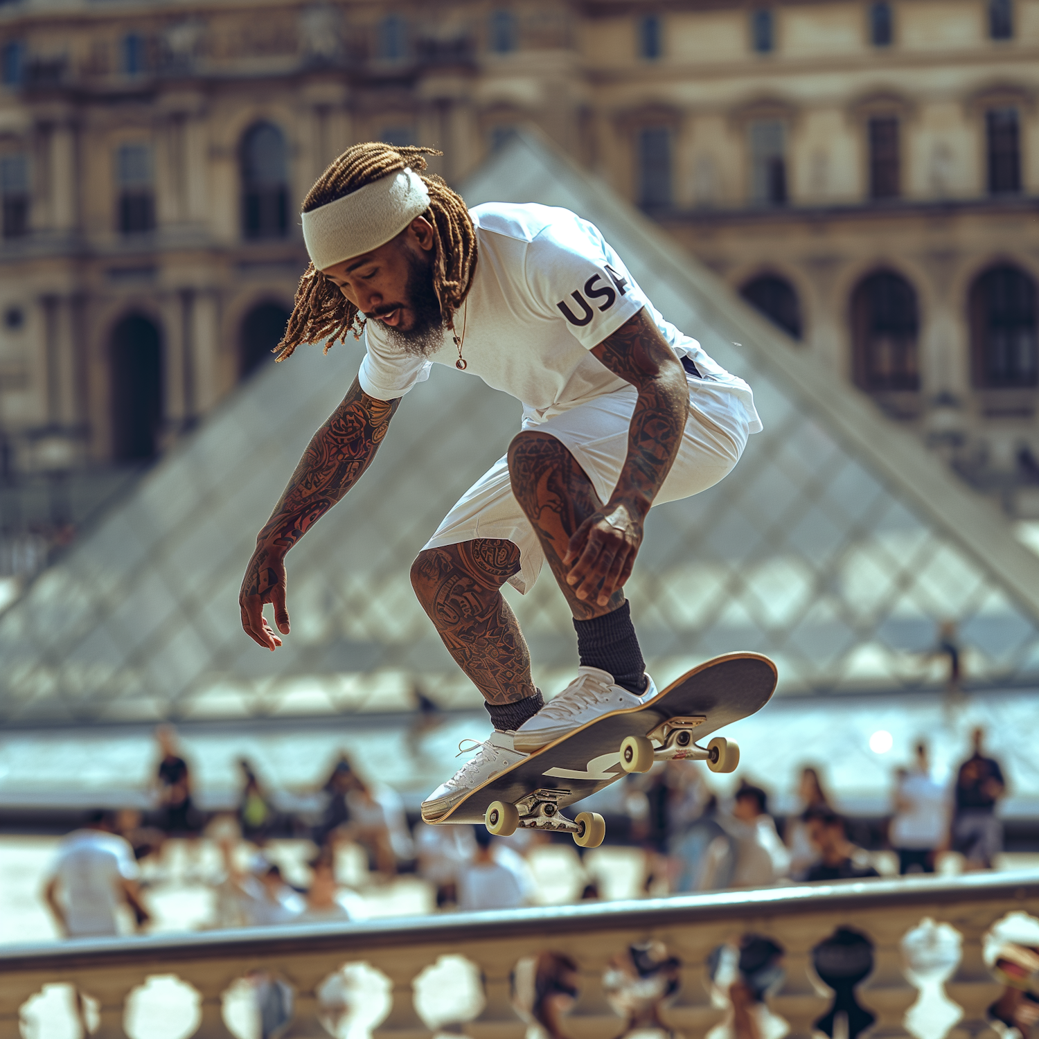 Dynamic shot of a tattooed skateboarder mid-air in front of the Louvre Pyramid, showcasing style and skill.