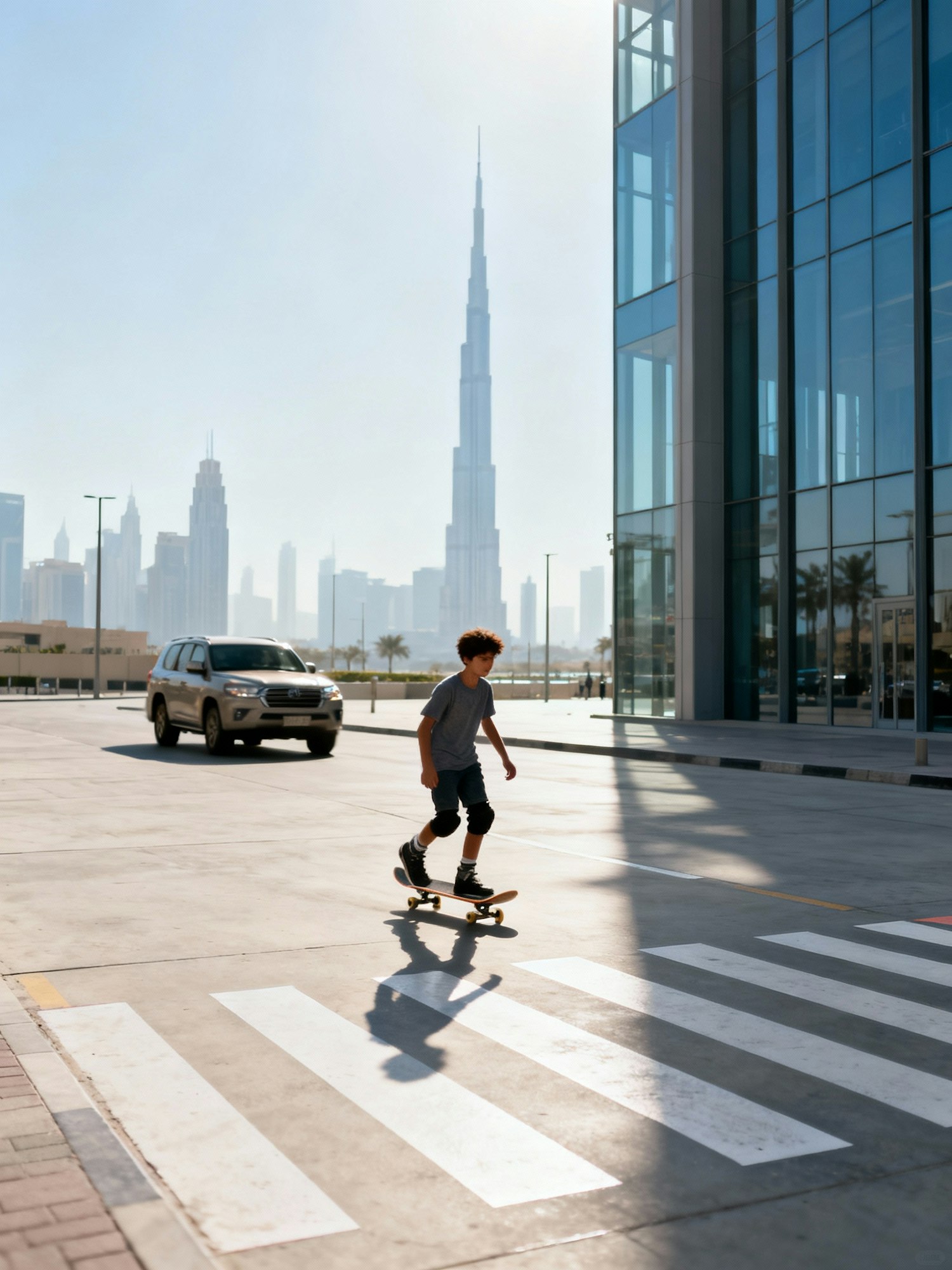 Sunny late-morning on a smooth plaza/street with Burj Khalifa framed in the background, clear sky; young skater rolling through a painted pedestrian area, SUV behind softly blurred; short, clean shadows, light concrete reflecting sun. Burj Khalifa slightly defocused but recognizable. 35 mm, 1/800 s, f/4, ISO 100, WB 5200 K; front-lit, mild bounce from glass façade to soften contrast. Negative: brand/store names, over-saturated blue, crunchy HDR pavement.