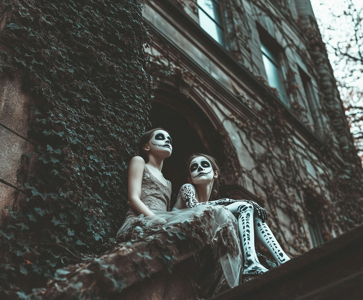 Two girls in skeleton costumes with skull face paint sit on an ivy-covered building ledge, creating a mysterious and eerie atmosphere.