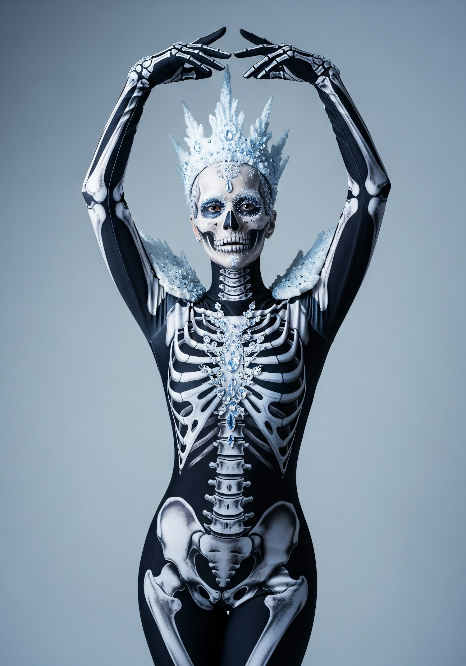 A person in a skeleton-themed costume with intricate details and a crystalline crown, posing elegantly against a neutral background.
