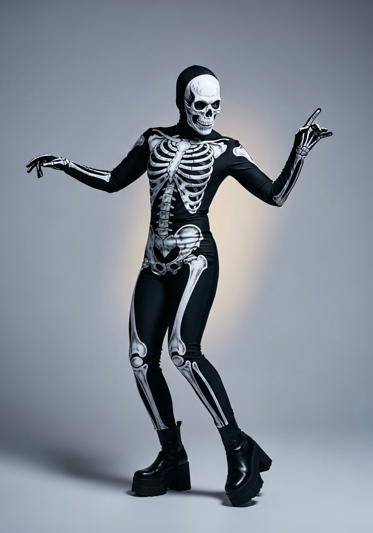 A person in a skeleton costume with a dynamic pose, wearing black platform boots, set against a neutral gradient background.