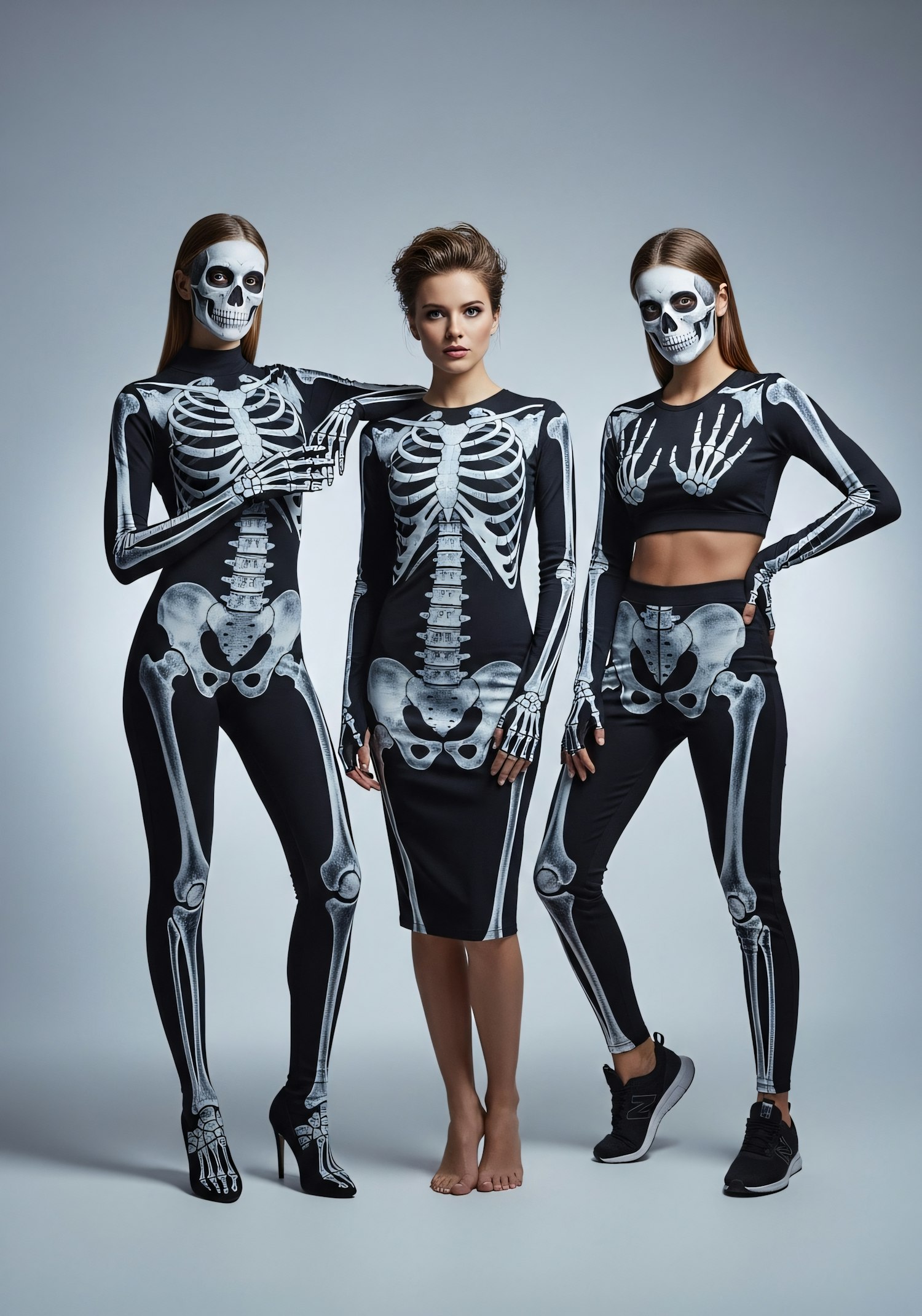 Three individuals in skeleton-themed outfits pose confidently, showcasing intricate designs and a striking monochrome aesthetic.