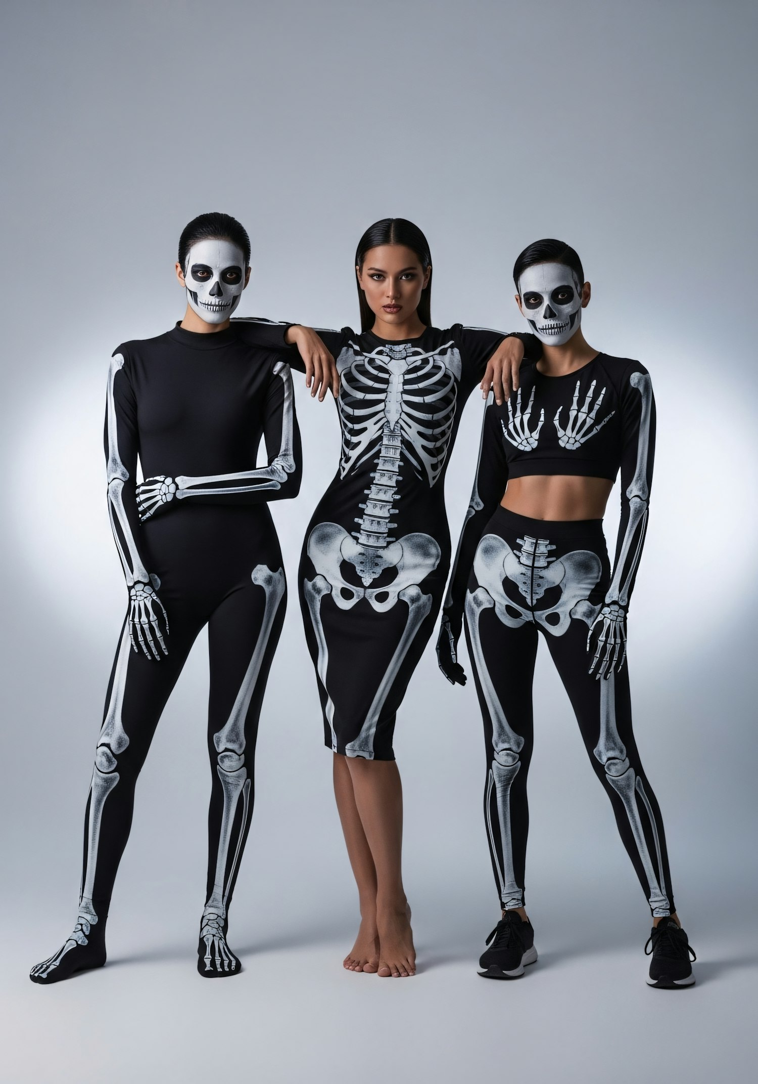 Three individuals in skeleton-themed outfits and face paint pose confidently against a neutral background.
