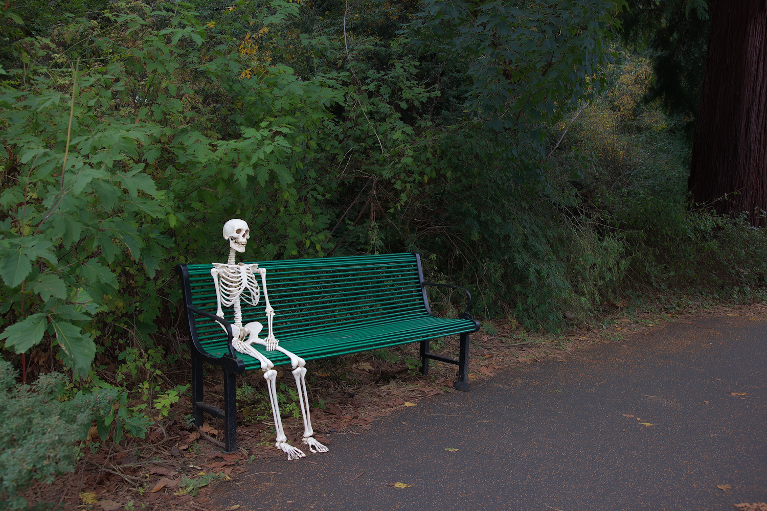 A creatively staged skeleton sitting on a park bench by a forest trail, blending humor with nature's beauty and tranquility.