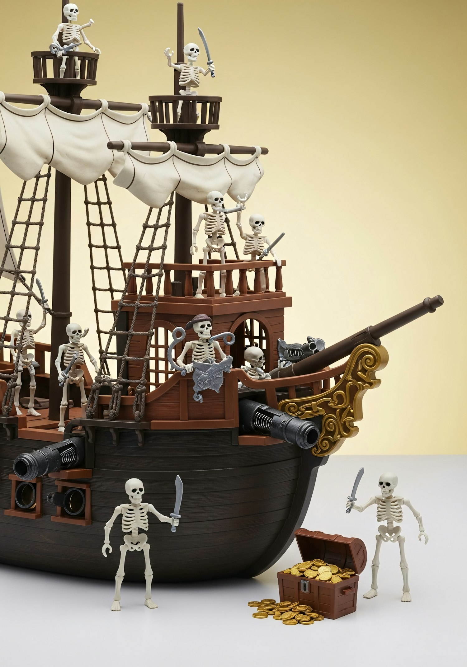A toy pirate ship with skeleton crew figurines, detailed sails, cannons, and a treasure chest filled with gold coins on a yellow background.