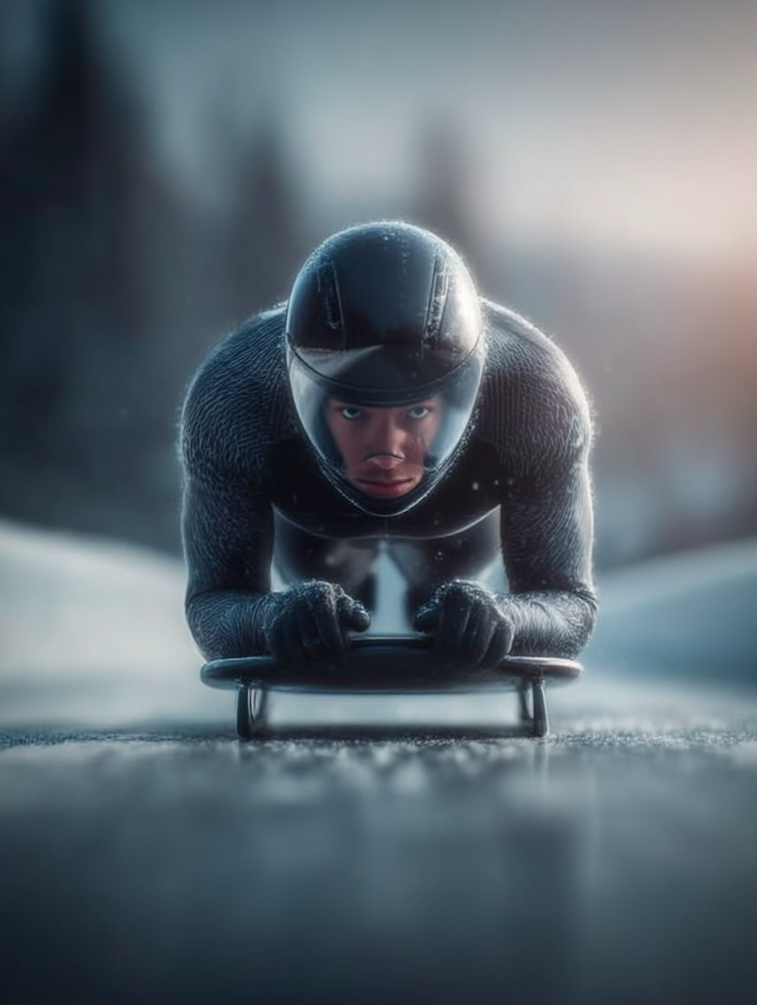 A determined athlete in a black helmet races down an icy track on a skeleton sled, showcasing speed and focus in a winter sports setting.