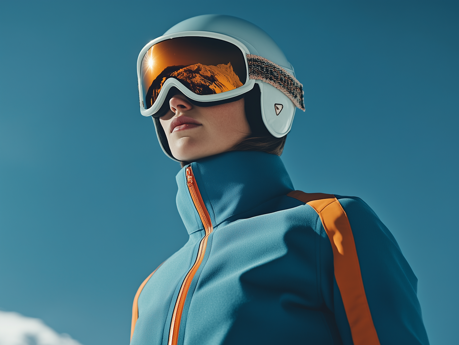 Person in blue and orange ski gear with reflective goggles, ready for skiing under a clear blue sky.