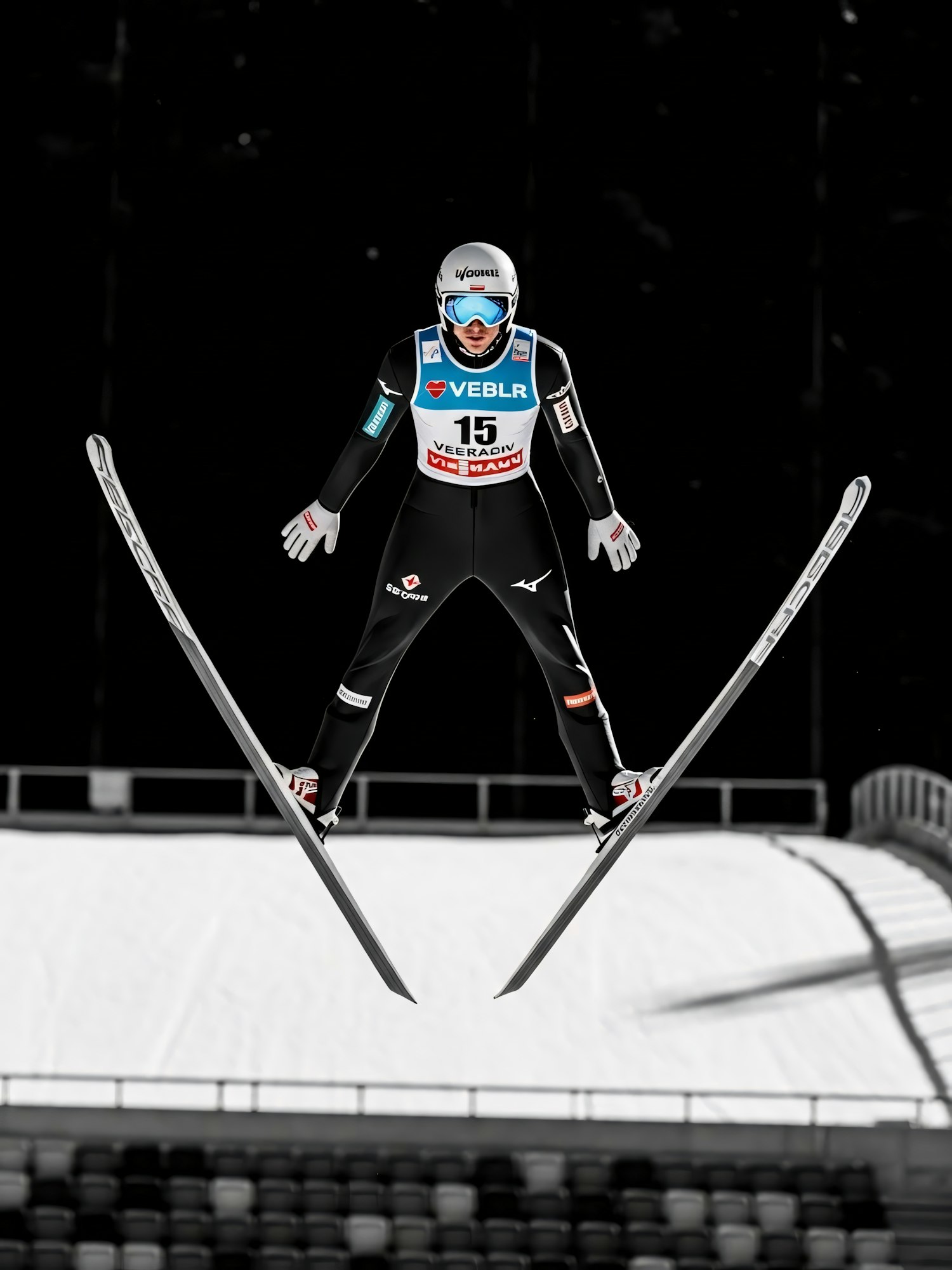 A ski jumper in mid-air, wearing a black suit and white helmet, against a snowy slope and dark background, showcasing the sport's intensity.
