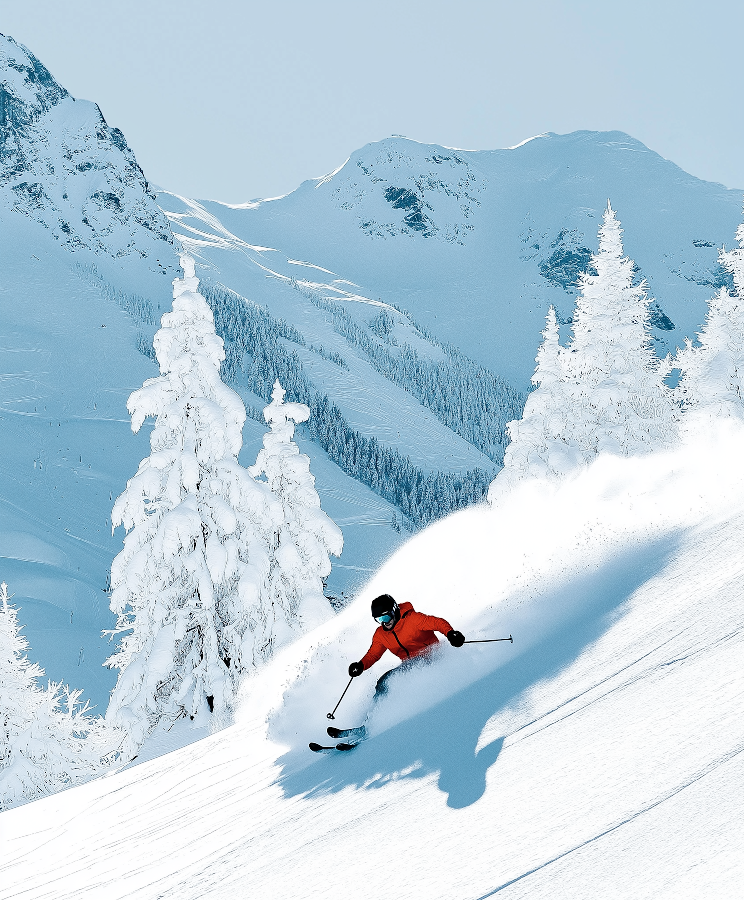 Skier in red jacket carving through fresh powder on a snowy mountain slope with snow-covered trees and peaks in the background.