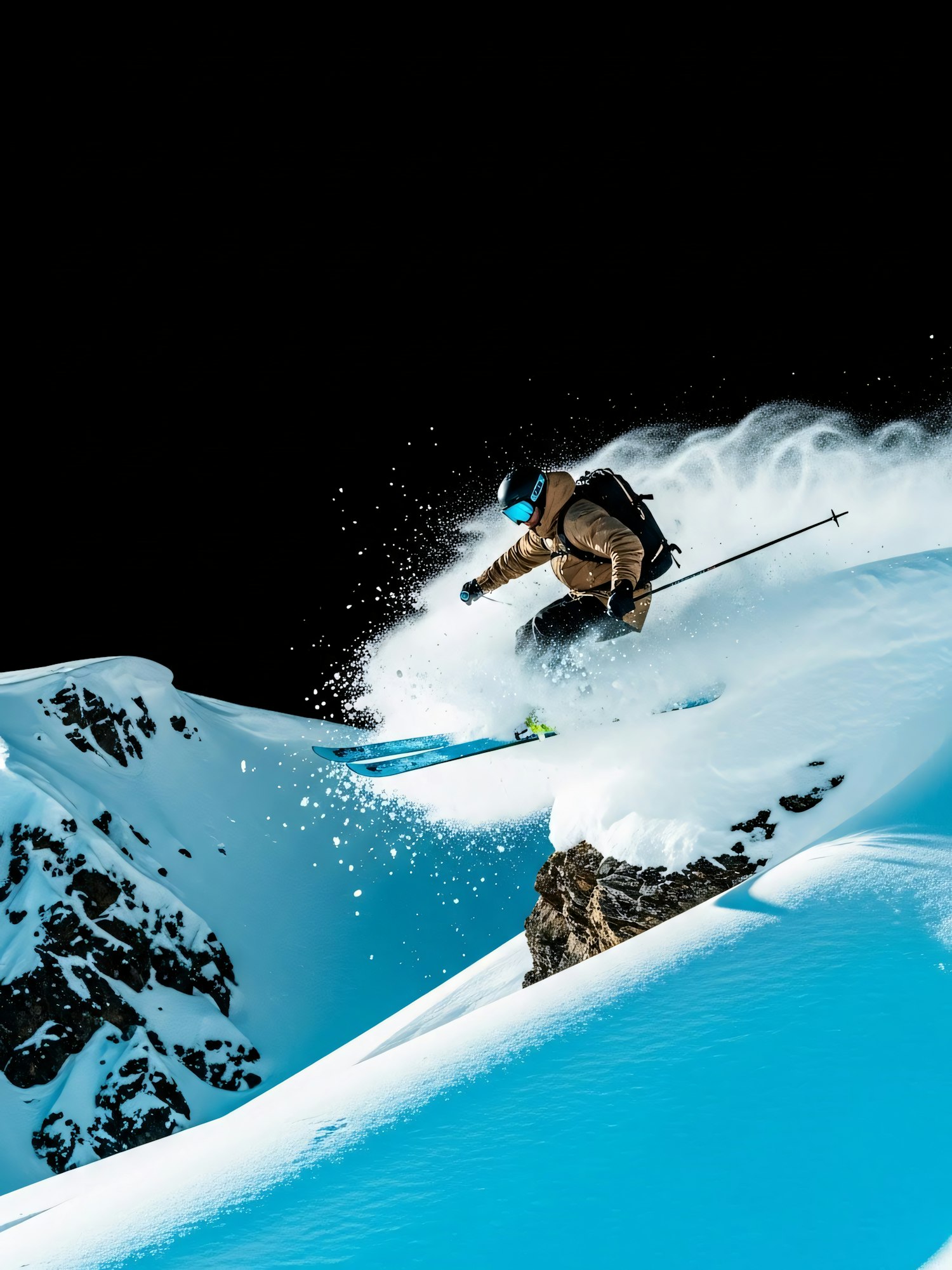 A skier performs a jump off a snowy cliff, surrounded by dramatic snow spray, set against a stark black background.