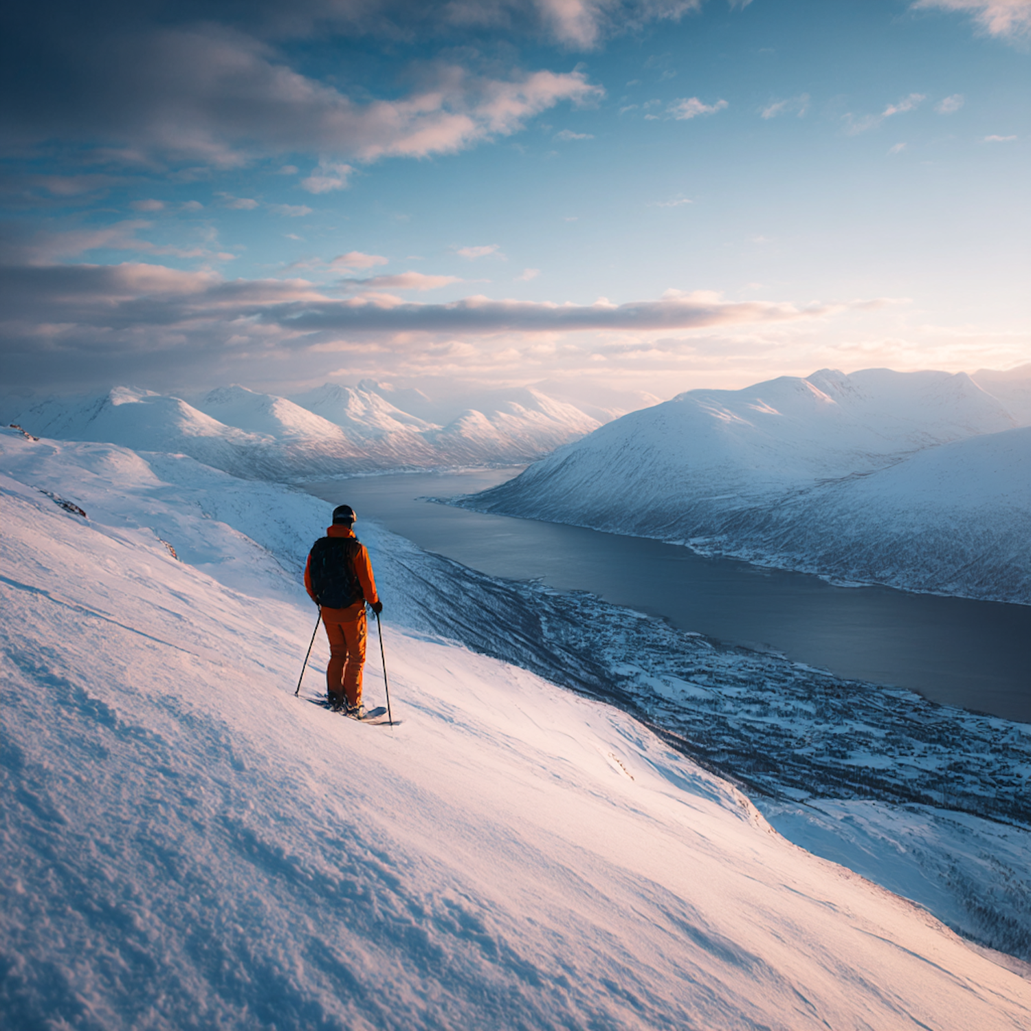A skier in orange gear stands on a snowy slope, overlooking a serene fjord and snow-covered mountains under a partly cloudy sky.