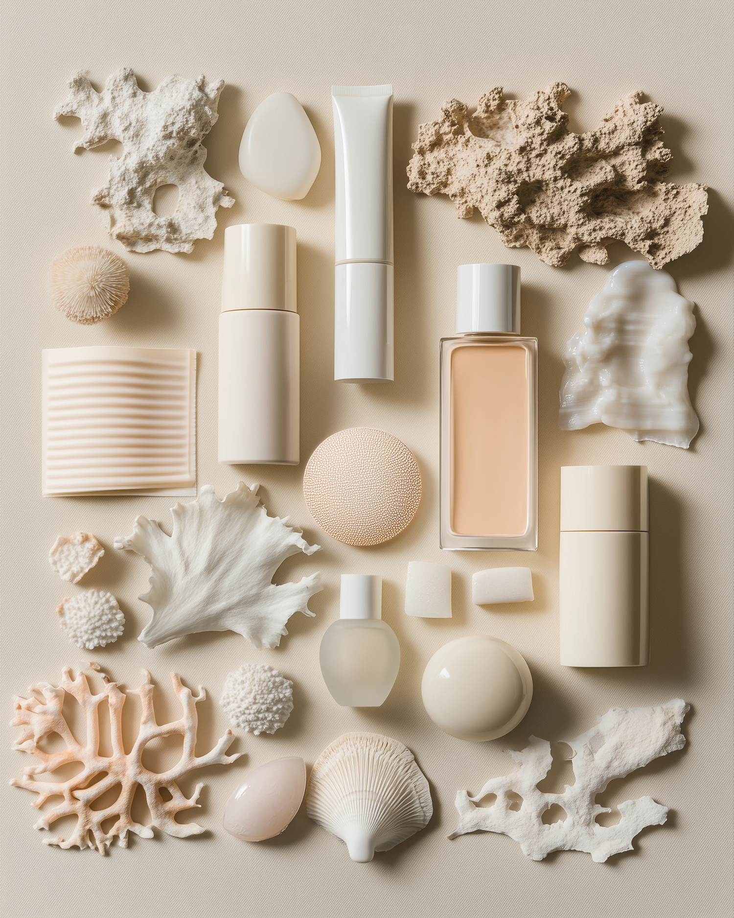 Elegant flat lay of skincare products and natural elements in beige tones, featuring bottles, tubes, and coral for a minimalist aesthetic.