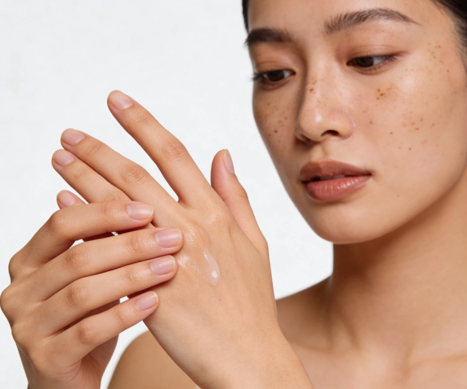 Close-up of a person with freckles applying a skincare product to their hand, showcasing a natural and clean aesthetic.