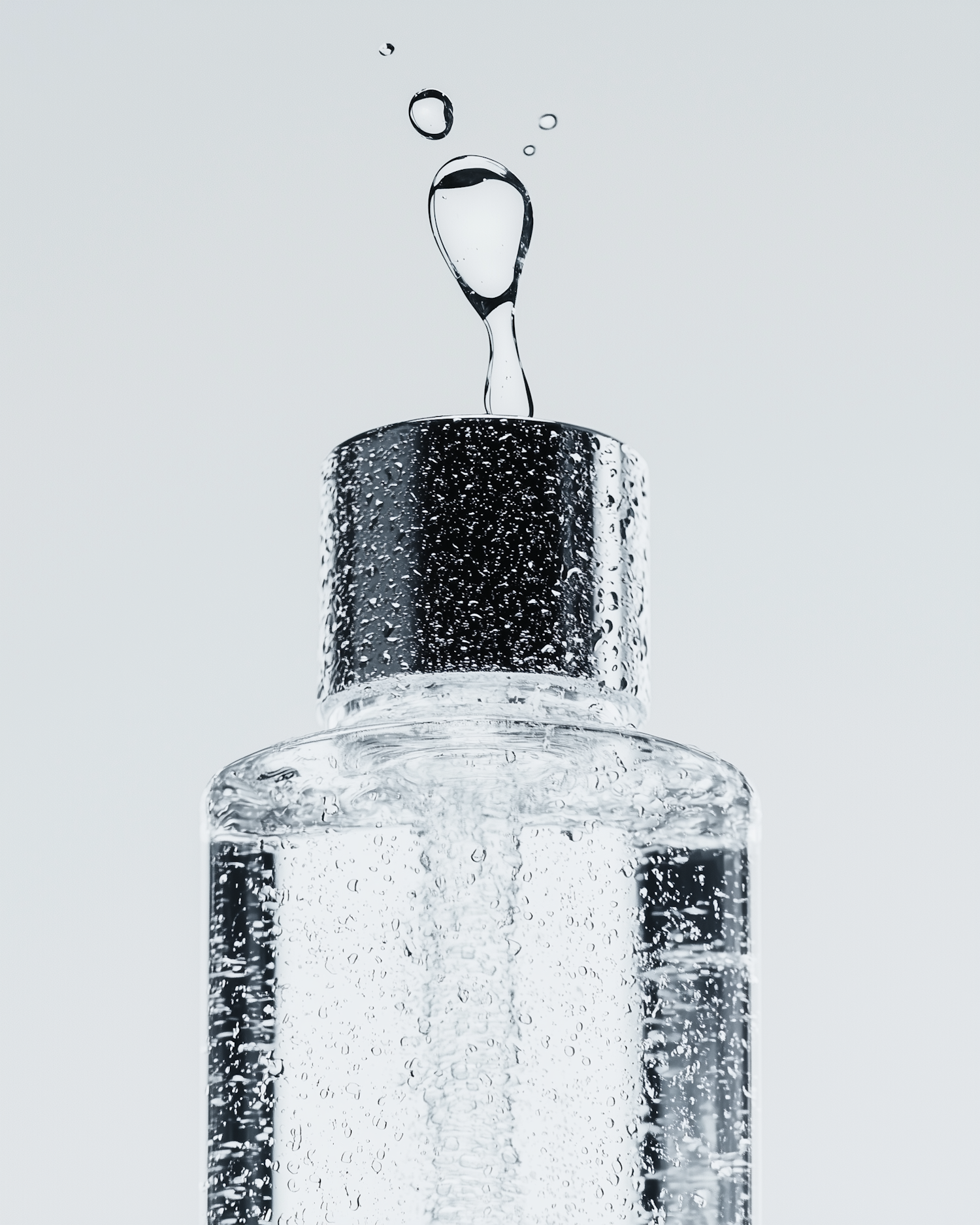 Close-up of a clear bottle with a metallic cap, air bubbles in liquid, and a droplet mid-air, perfect for skincare or cosmetic themes.