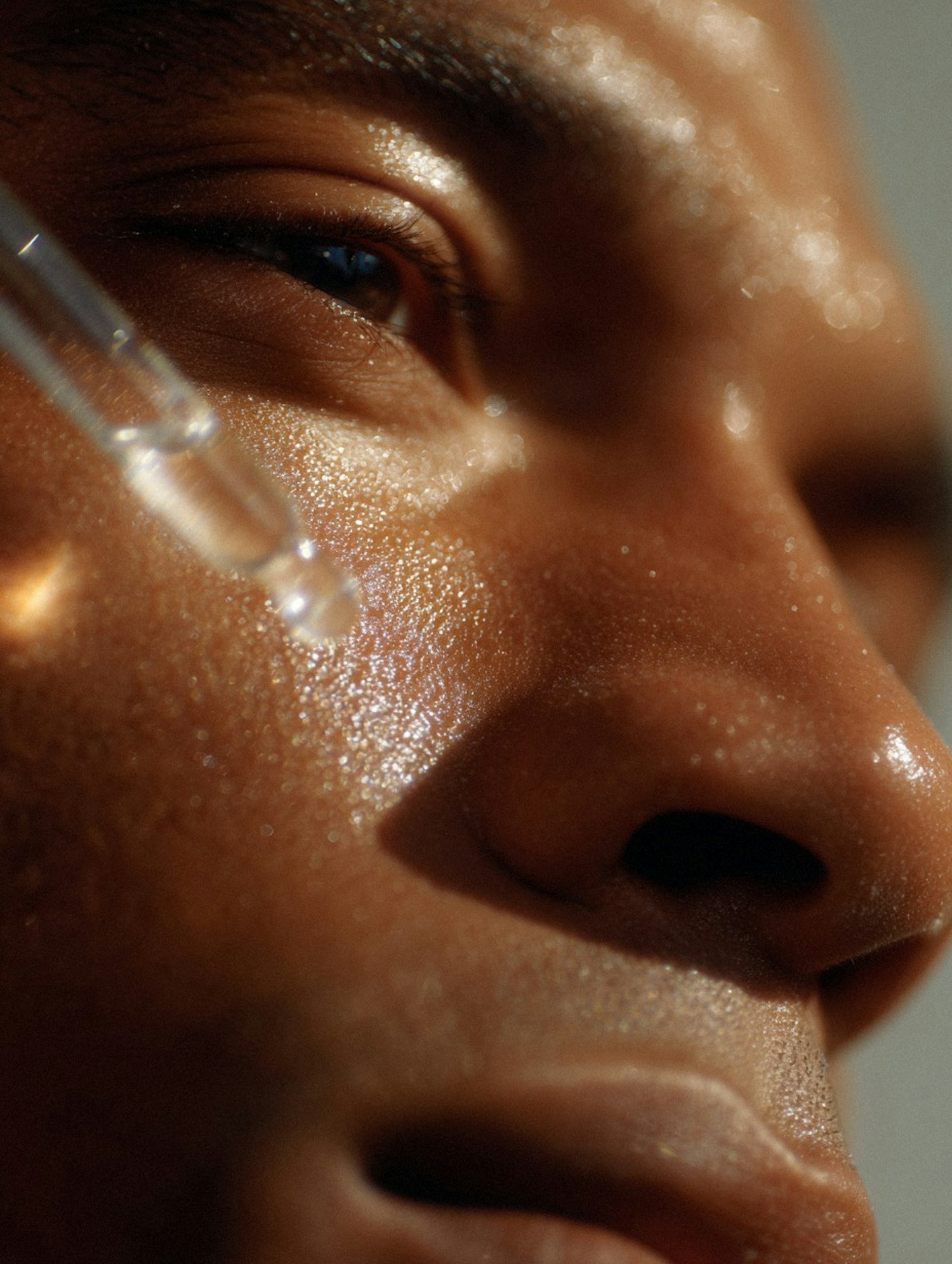 Close-up of a moisturized face with a dropper applying skincare serum, highlighting hydration and self-care.