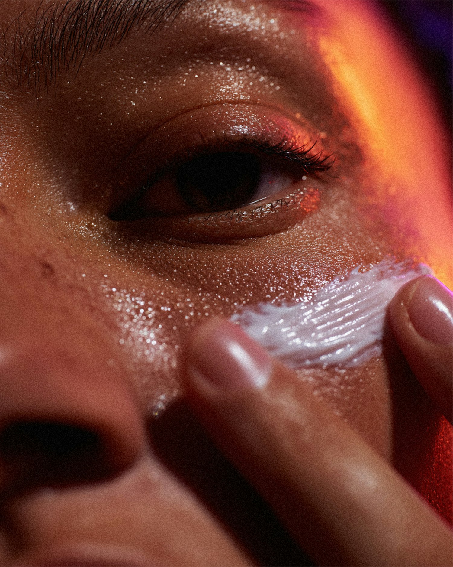 Close-up of a moisturized face with cream being applied, illuminated by warm and vibrant lighting for a dramatic effect.