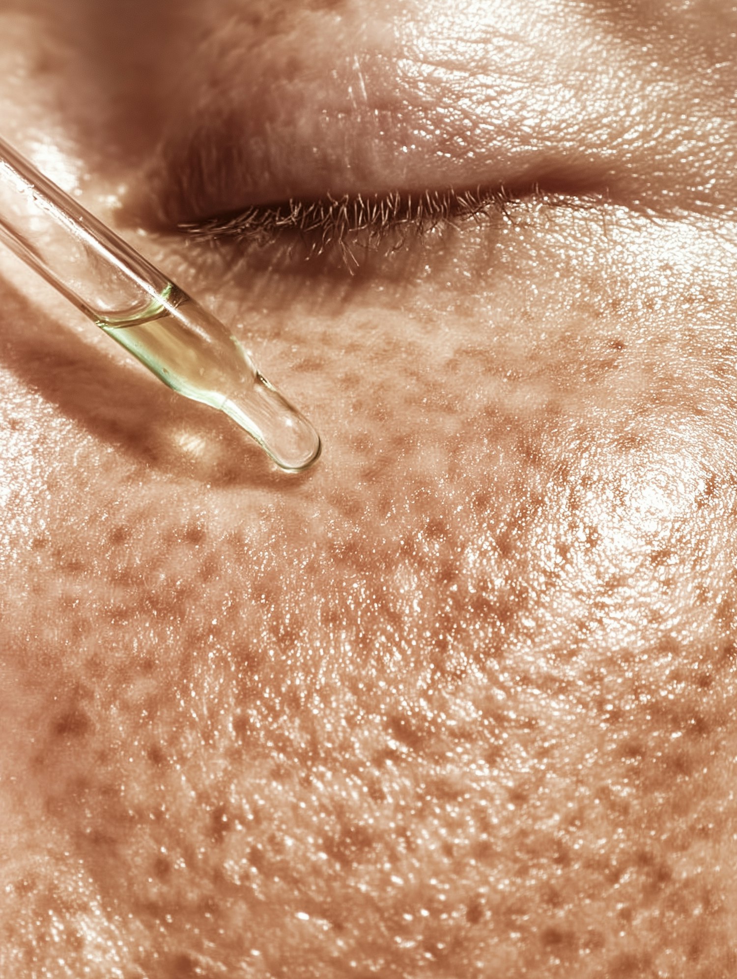 Close-up of skin with a dropper applying a clear liquid, highlighting texture and hydration. Perfect for skincare or beauty themes.
