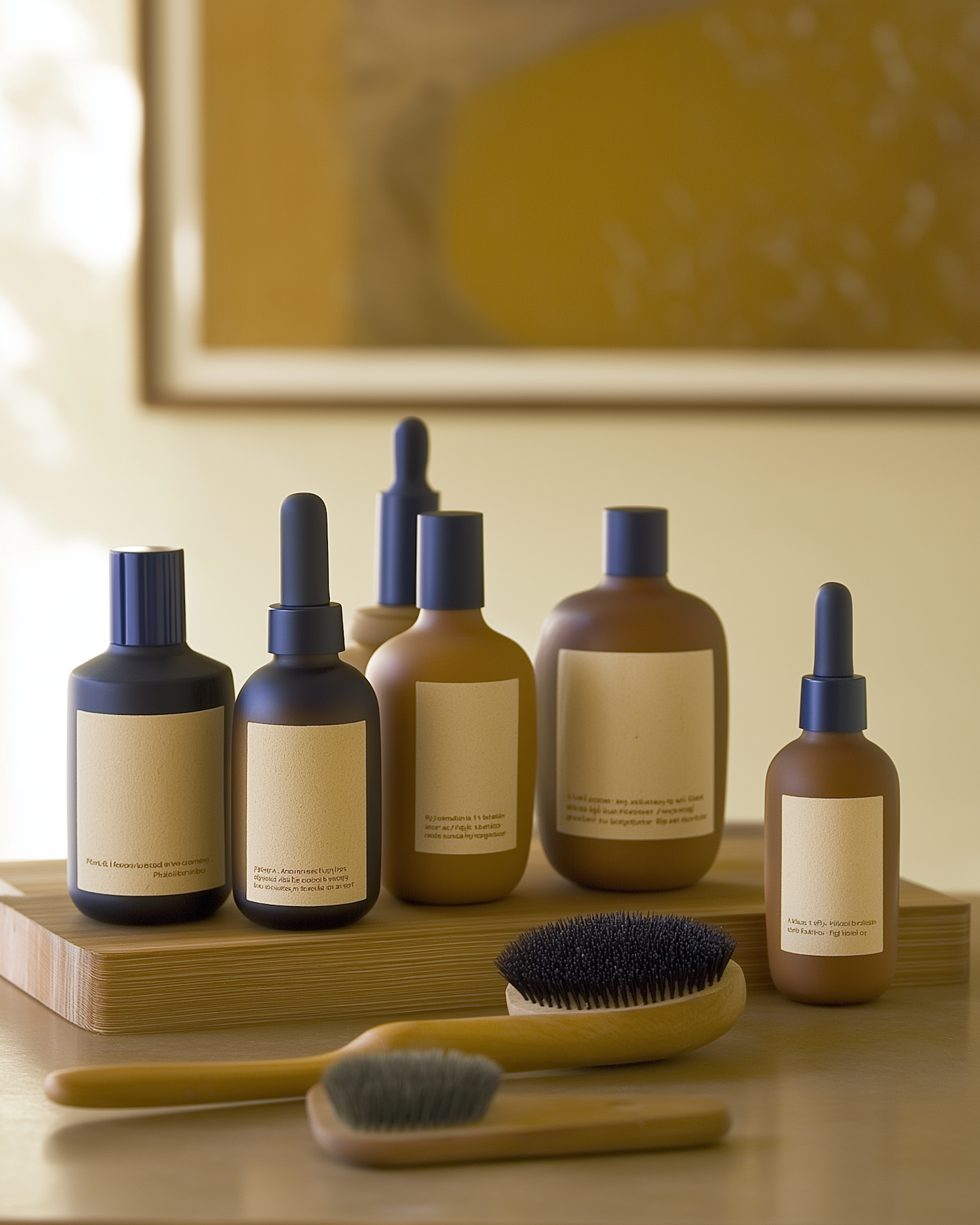Elegant skincare bottles and wooden brushes on a warm-toned surface, exuding a natural and minimalist aesthetic.