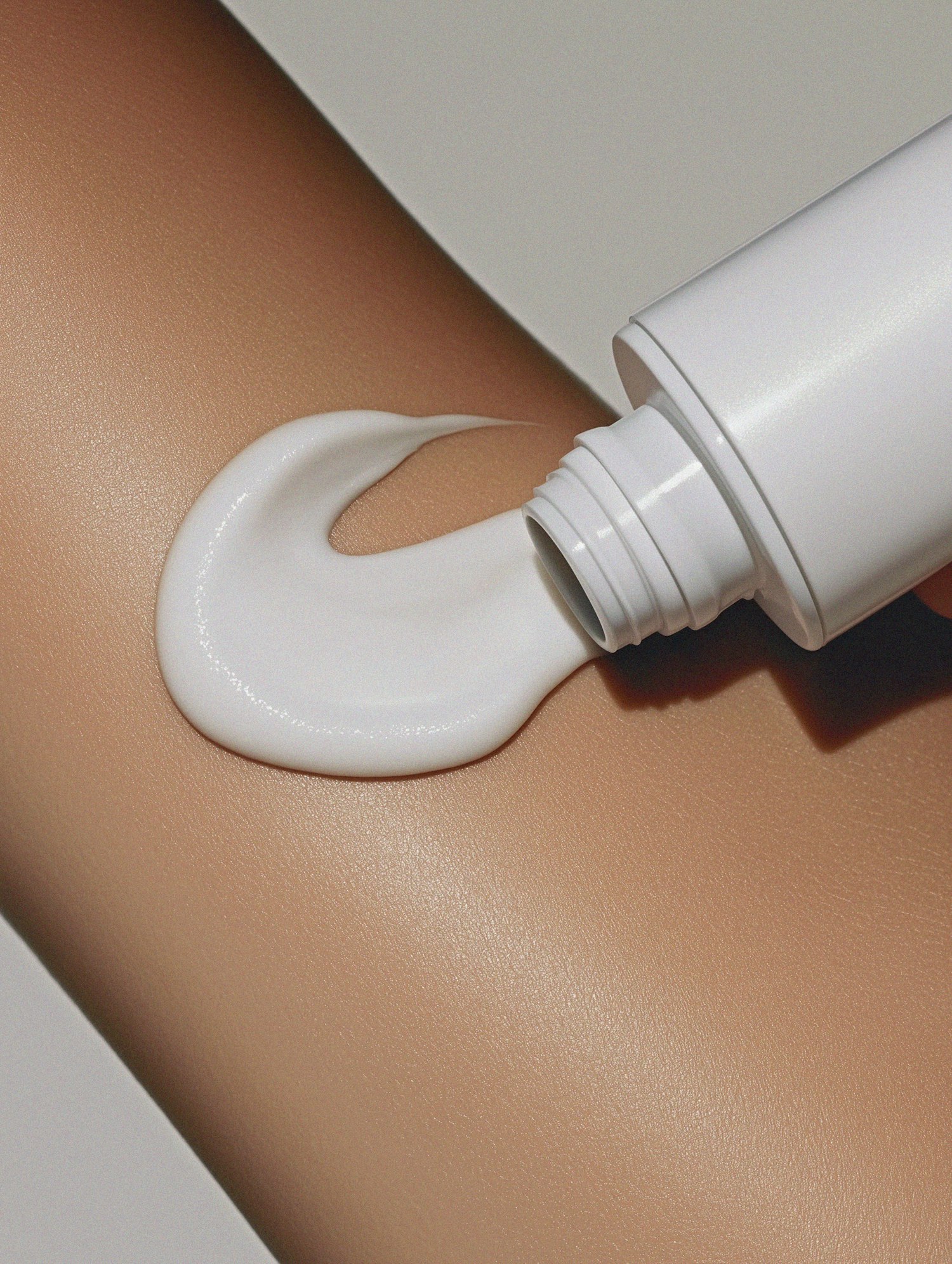 Close-up of white cream from a sleek tube on smooth tan skin, showcasing skincare product application with a clean, modern vibe.