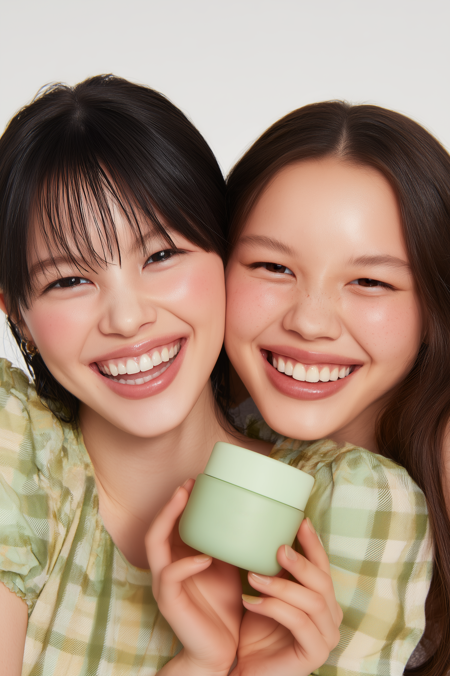 Two smiling individuals holding a green cosmetic container, dressed in matching plaid outfits, radiating joy and positivity.