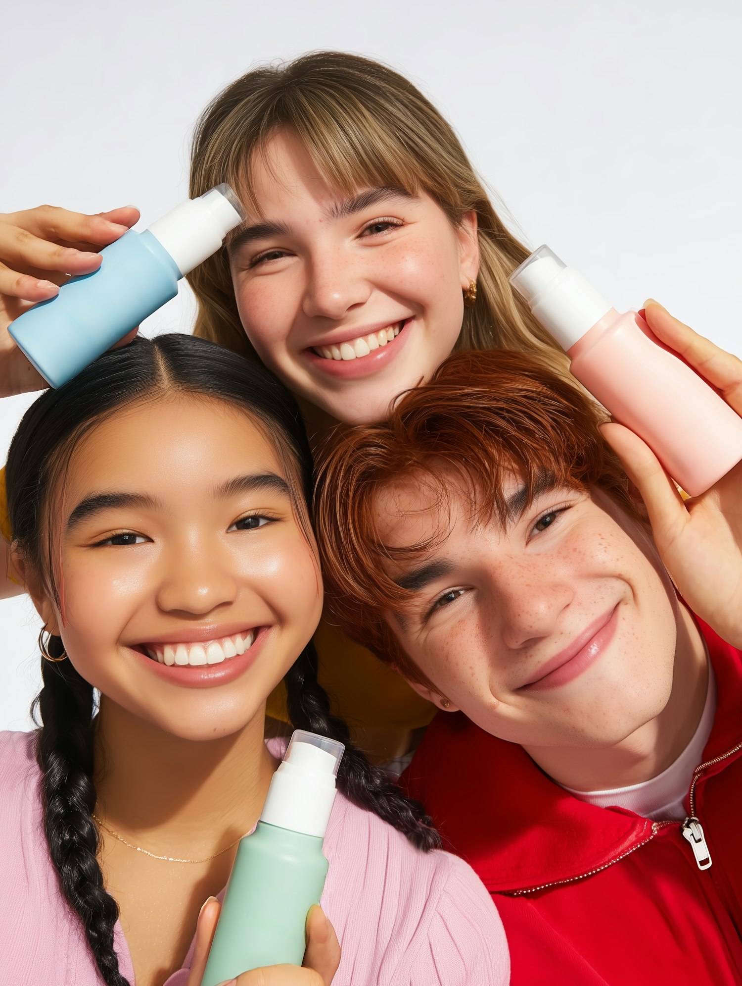 Three smiling friends holding colorful skincare bottles, showcasing vibrant energy and a fresh aesthetic.