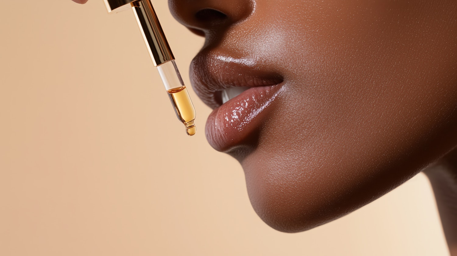Close-up of glossy lips and radiant skin with a dropper of golden oil, highlighting hydration and skincare in a soft beige setting.