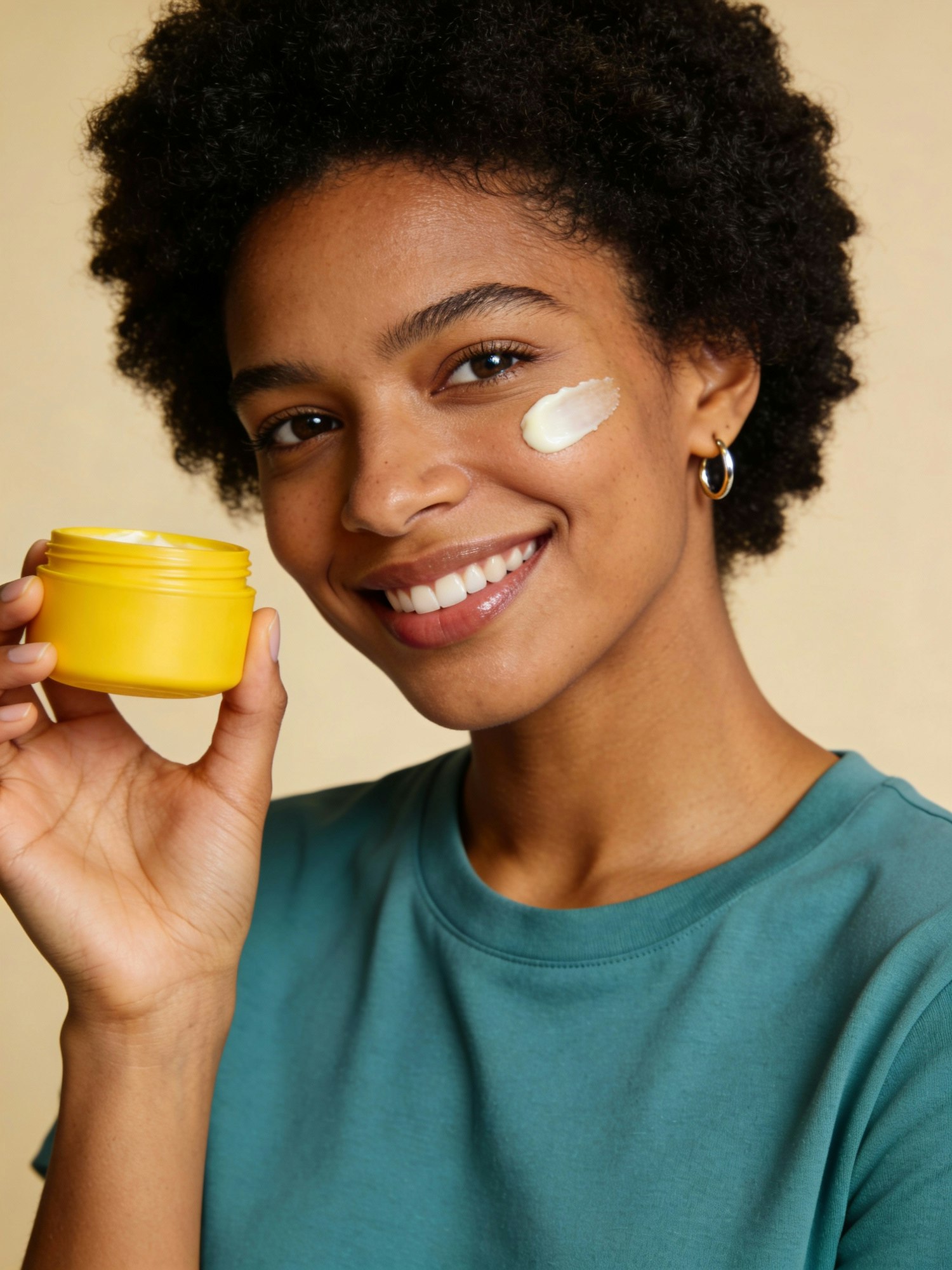 A smiling person with curly hair holds a yellow container, with a dab of cream under their eye, radiating joy and skincare vibes. With rich brown skin and short, natural, full hair gazes directly into the camera, his expression calm and grounded. She wears a teal crew neck shirt—simple, soft, and modern—paired with a small hoop earring in her left ear. The background is plain and light-toned, creating a clean visual field that draws focus to her face and silhouette. Lighting is soft and even, highlighting skin texture, the gentle curve of the neckline, and the subtle metallic glint of the earring. The mood is introspective and quietly confident, blending minimalism with emotional resonance. Hyperrealistic rendering should emphasize skin detail, fabric texture, and tonal harmony across wardrobe, background, and complexion.