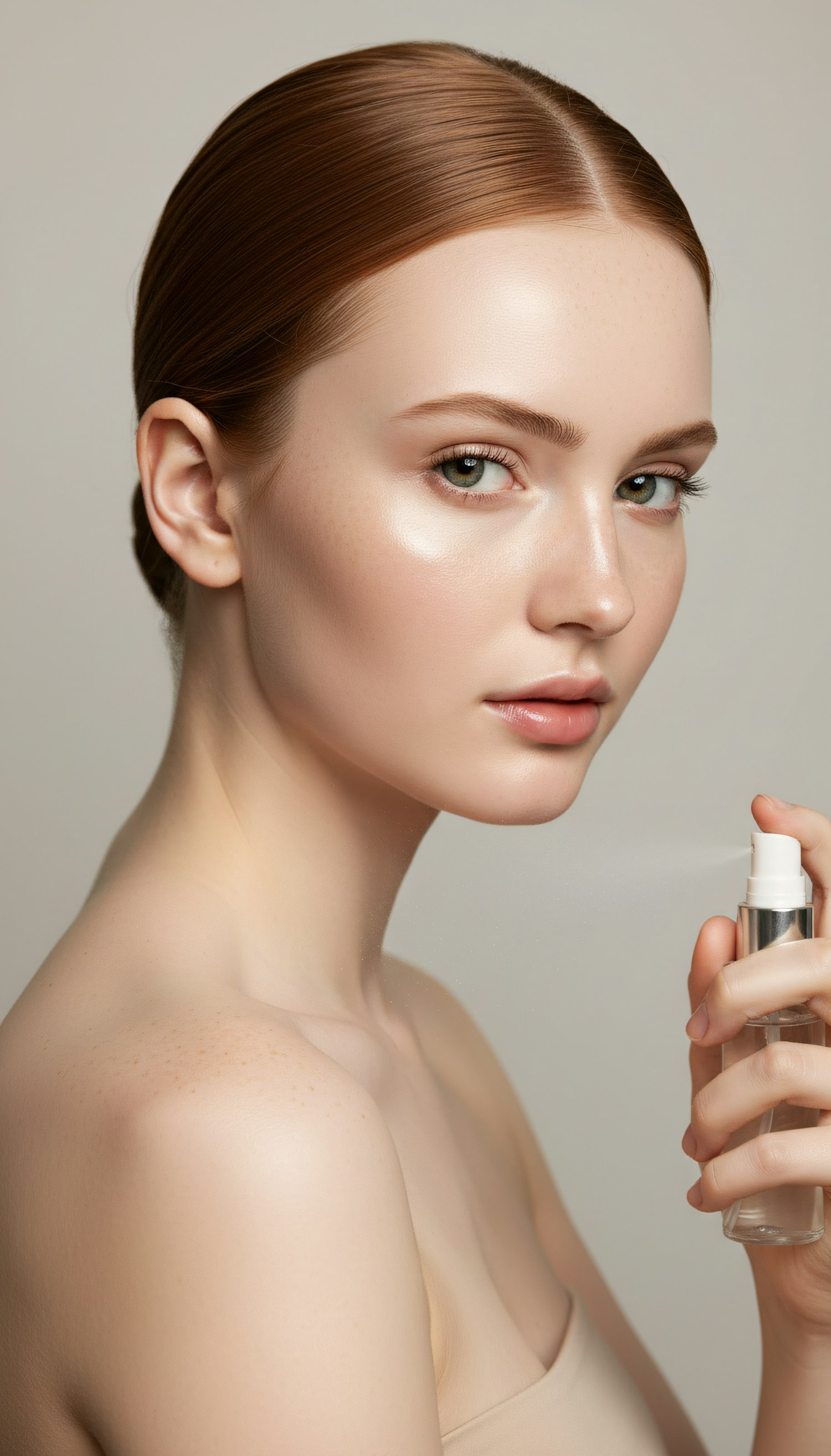 A young woman with radiant skin and auburn hair holds a spray bottle, showcasing a natural beauty and skincare concept.