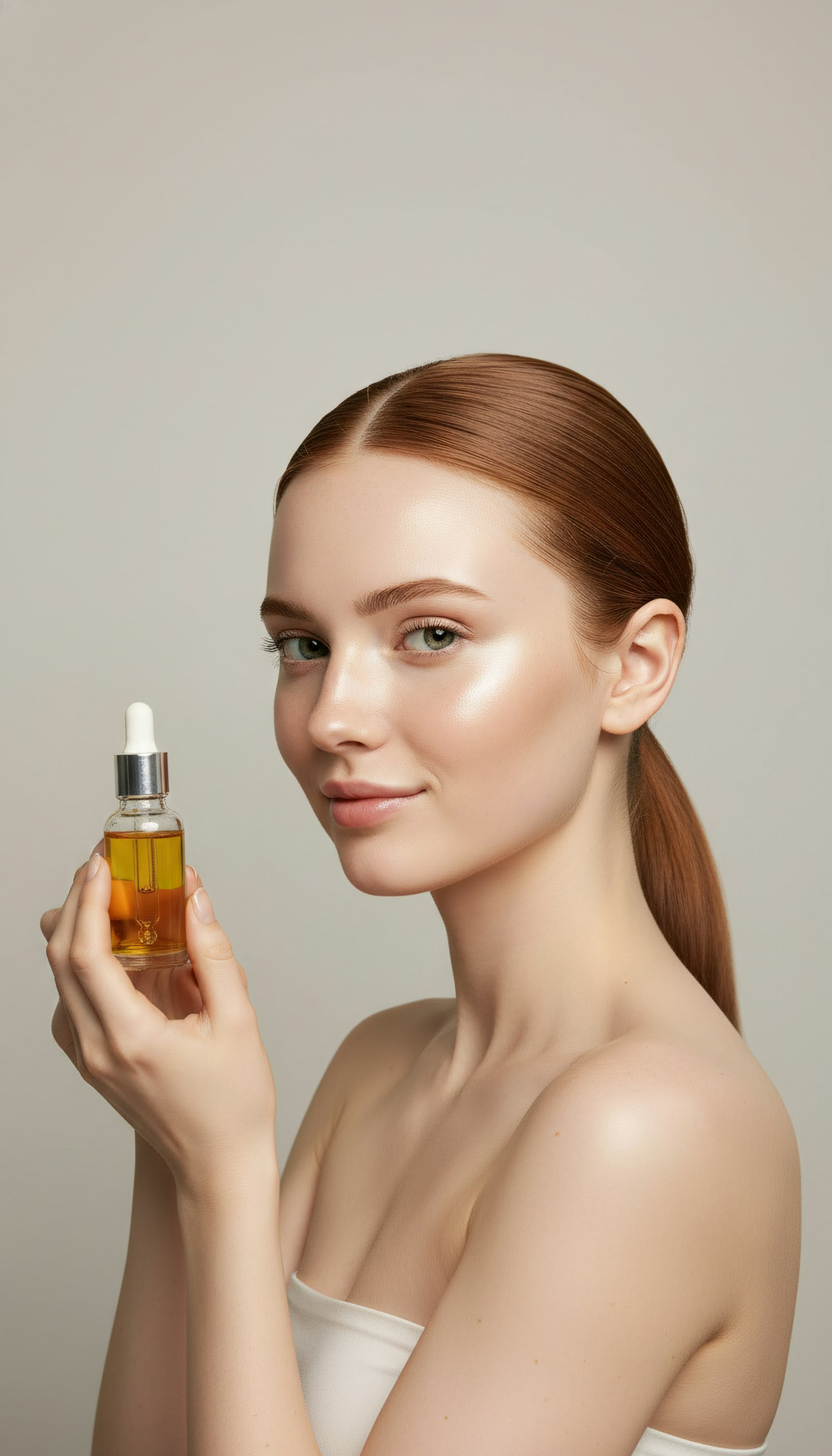 A young woman with glowing skin holds a bottle of golden liquid, showcasing a skincare product in a clean, neutral setting.