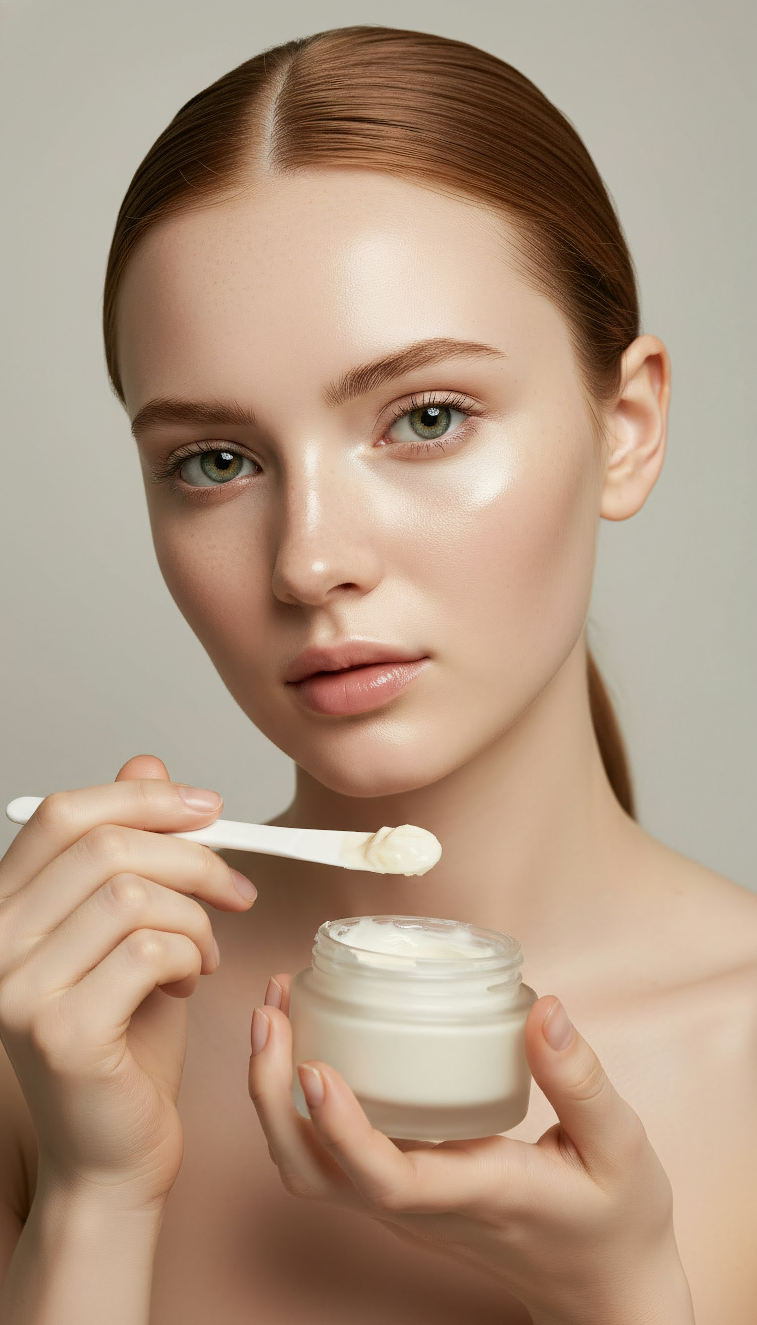 A young woman with radiant skin holds a jar of cream, showcasing a skincare product in a clean and minimalistic setting.