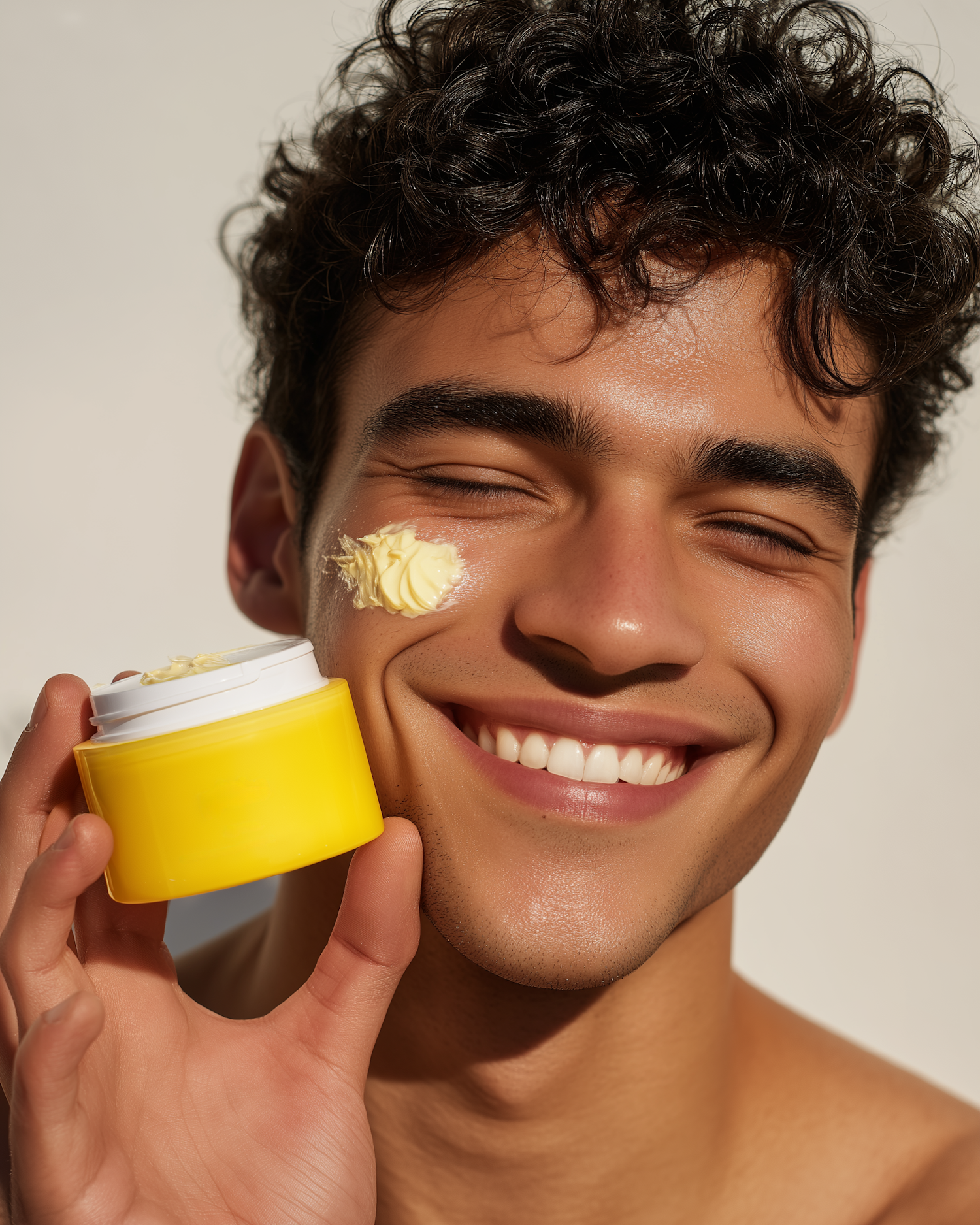 A cheerful young man with glowing skin holds a yellow jar of cream, showcasing skincare in a bright and natural setting.
