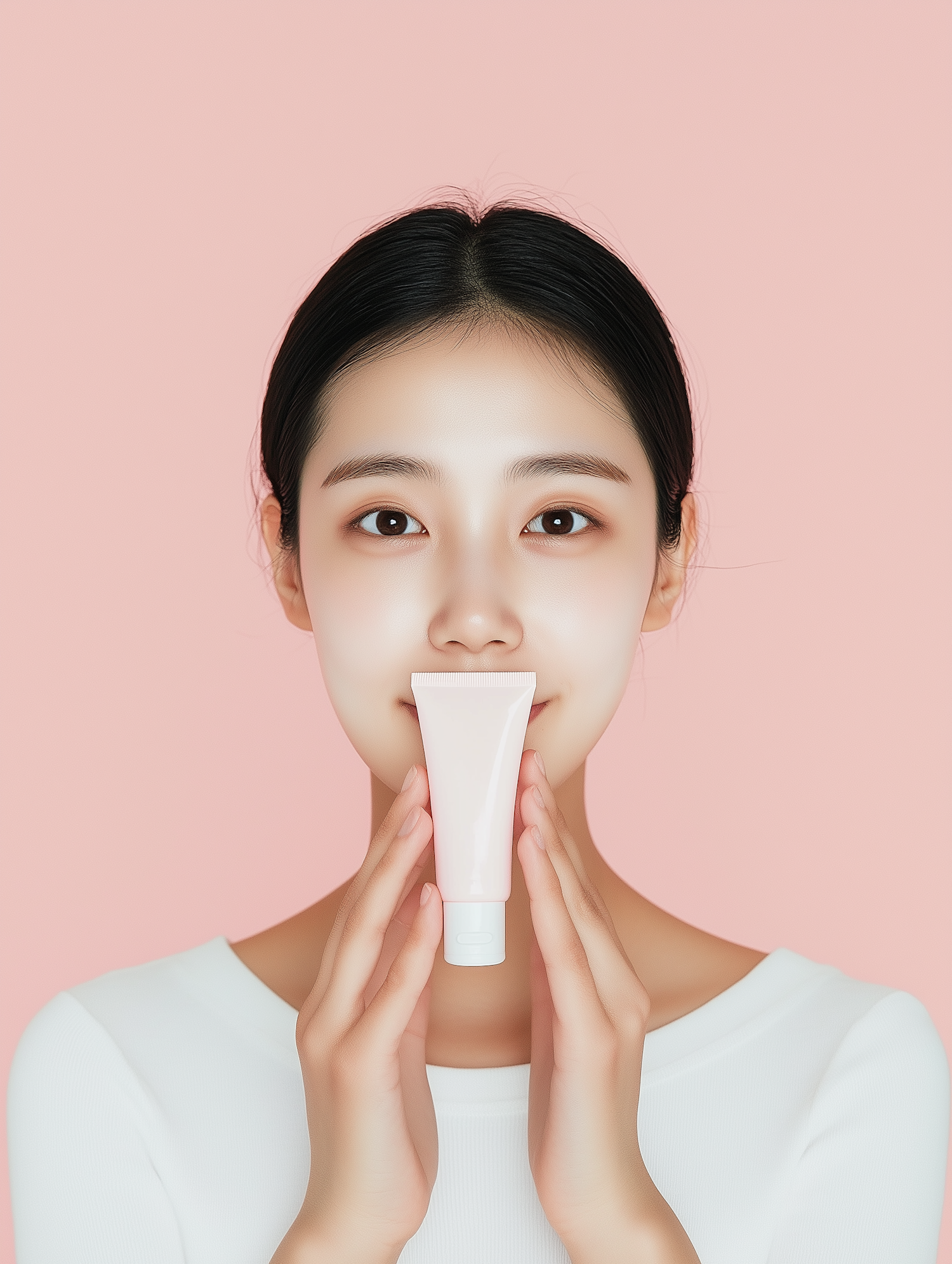 Asian woman holding a skincare cream tube against a soft pink background, exuding a calm and soothing vibe.