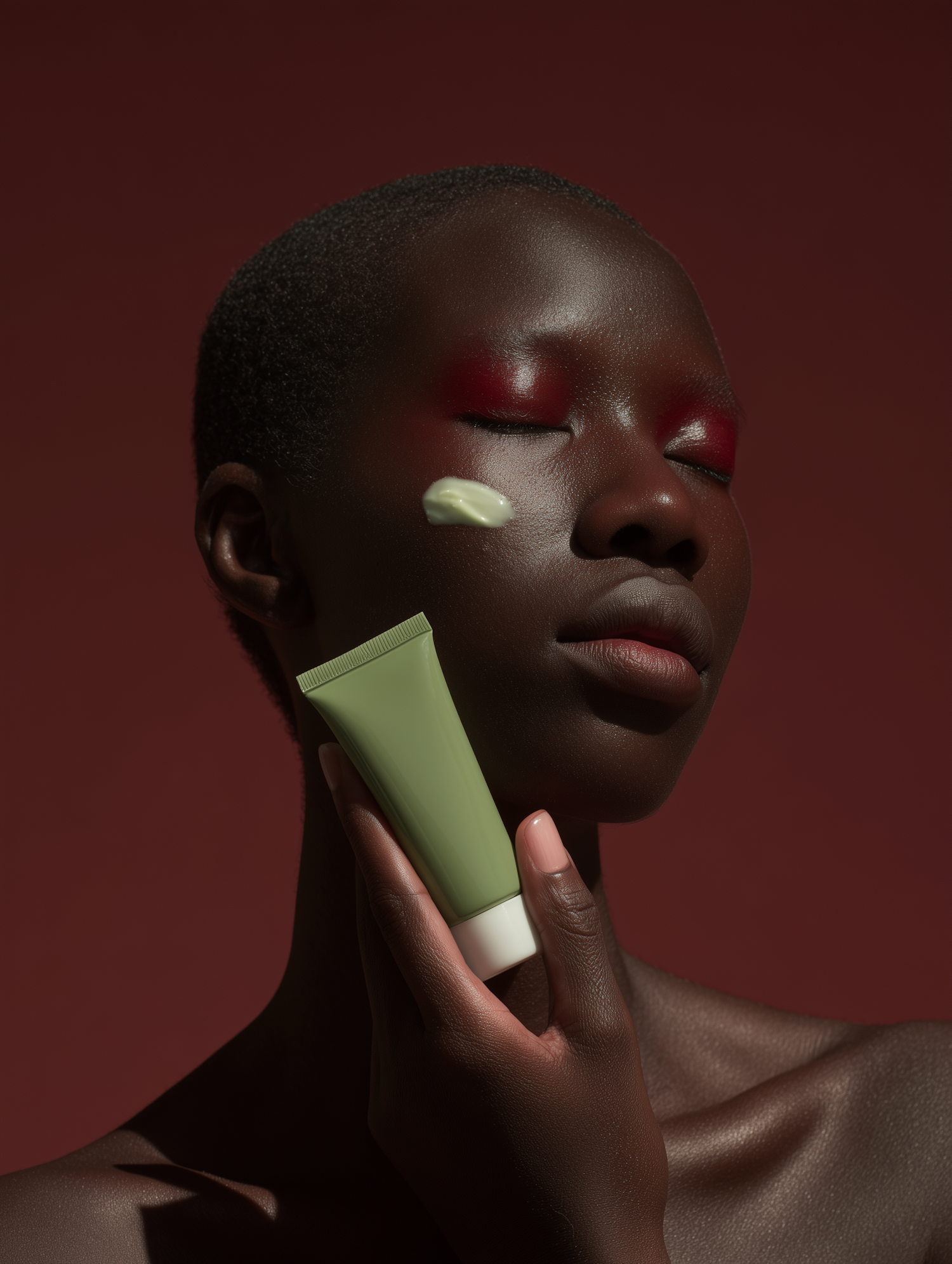 Close-up of a person with dark skin holding a green skincare tube, with cream applied to their cheek, set against a red background.