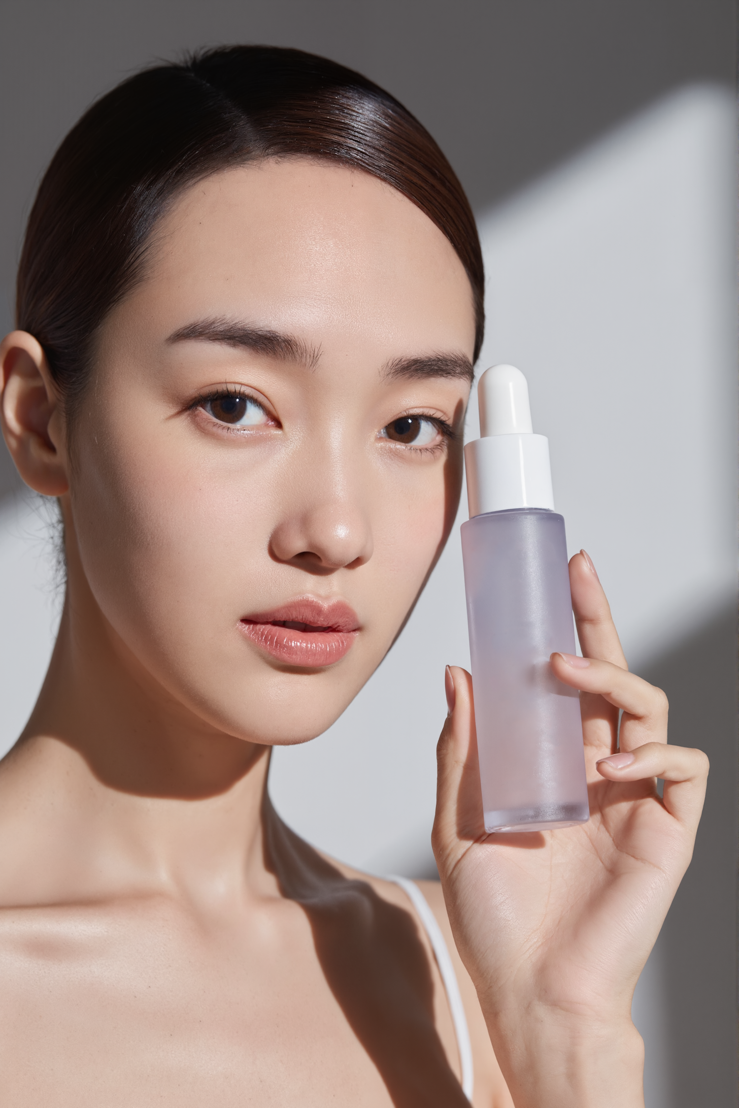 A young woman with flawless skin holds a frosted serum bottle, showcasing a minimalistic skincare aesthetic in soft natural light.