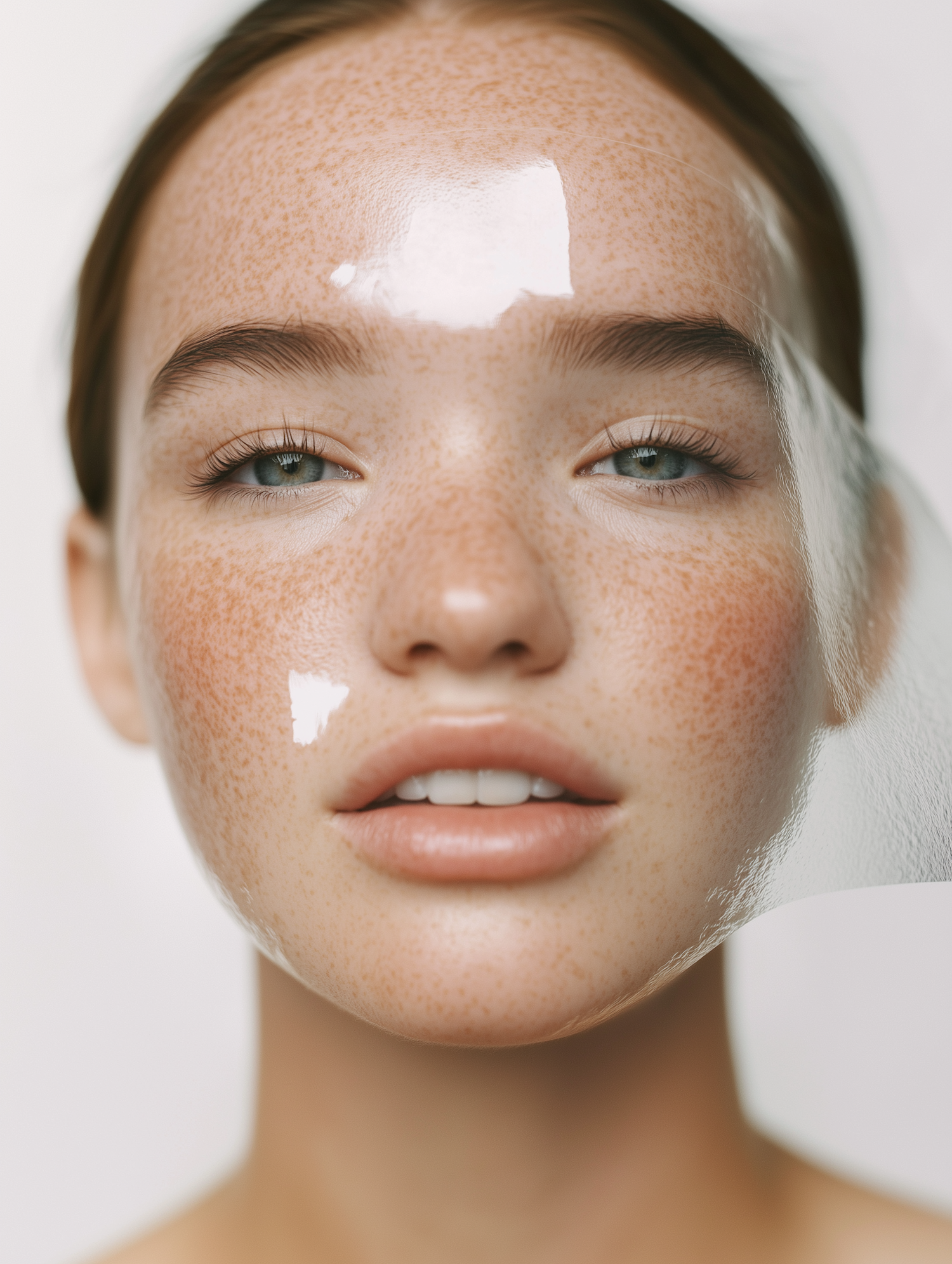 Close-up of a freckled woman peeling off a glossy facial mask, revealing smooth skin. Perfect for skincare or beauty-related content.