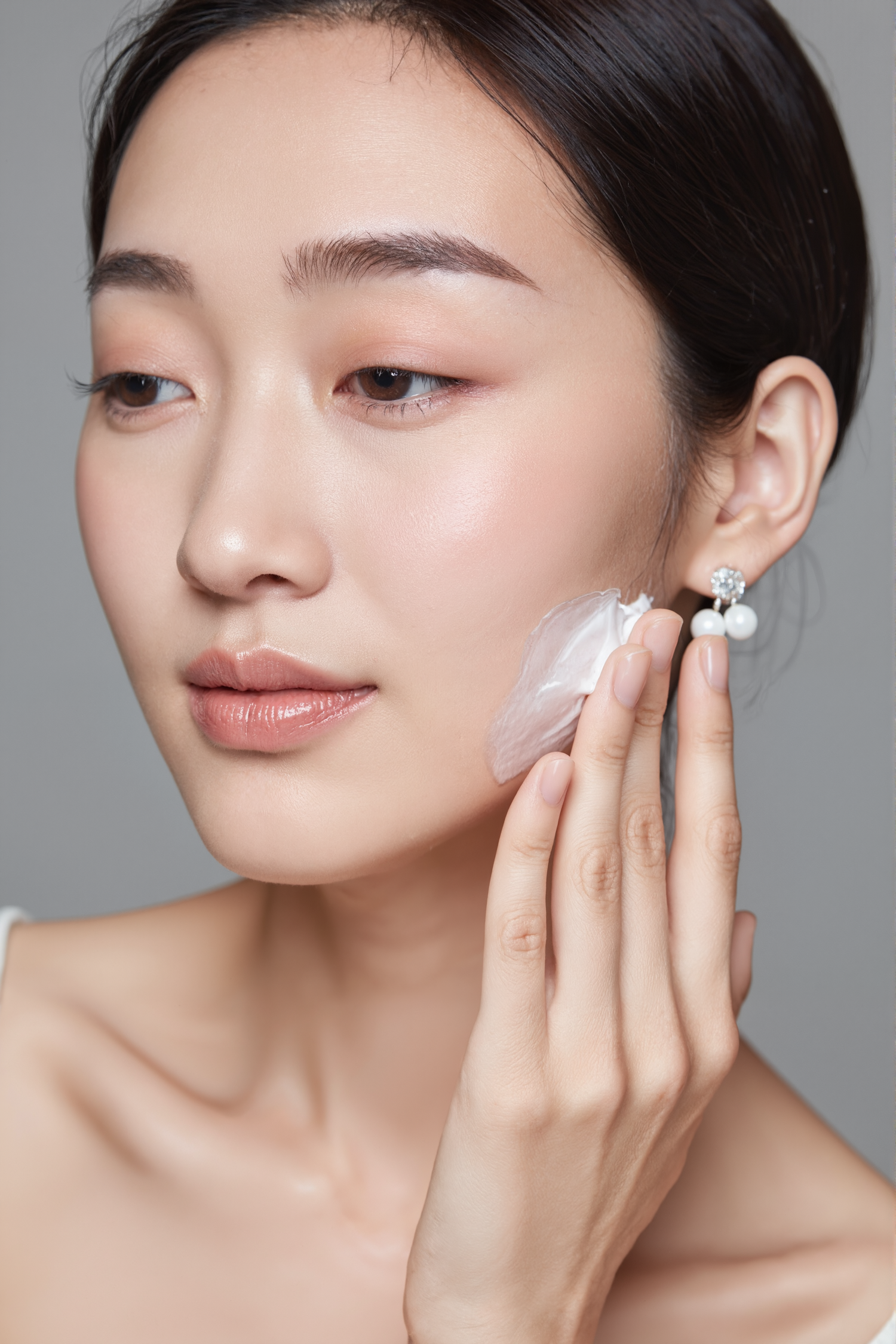 Close-up of a woman applying cream to her cheek, showcasing glowing skin, natural makeup, and elegant pearl earrings.