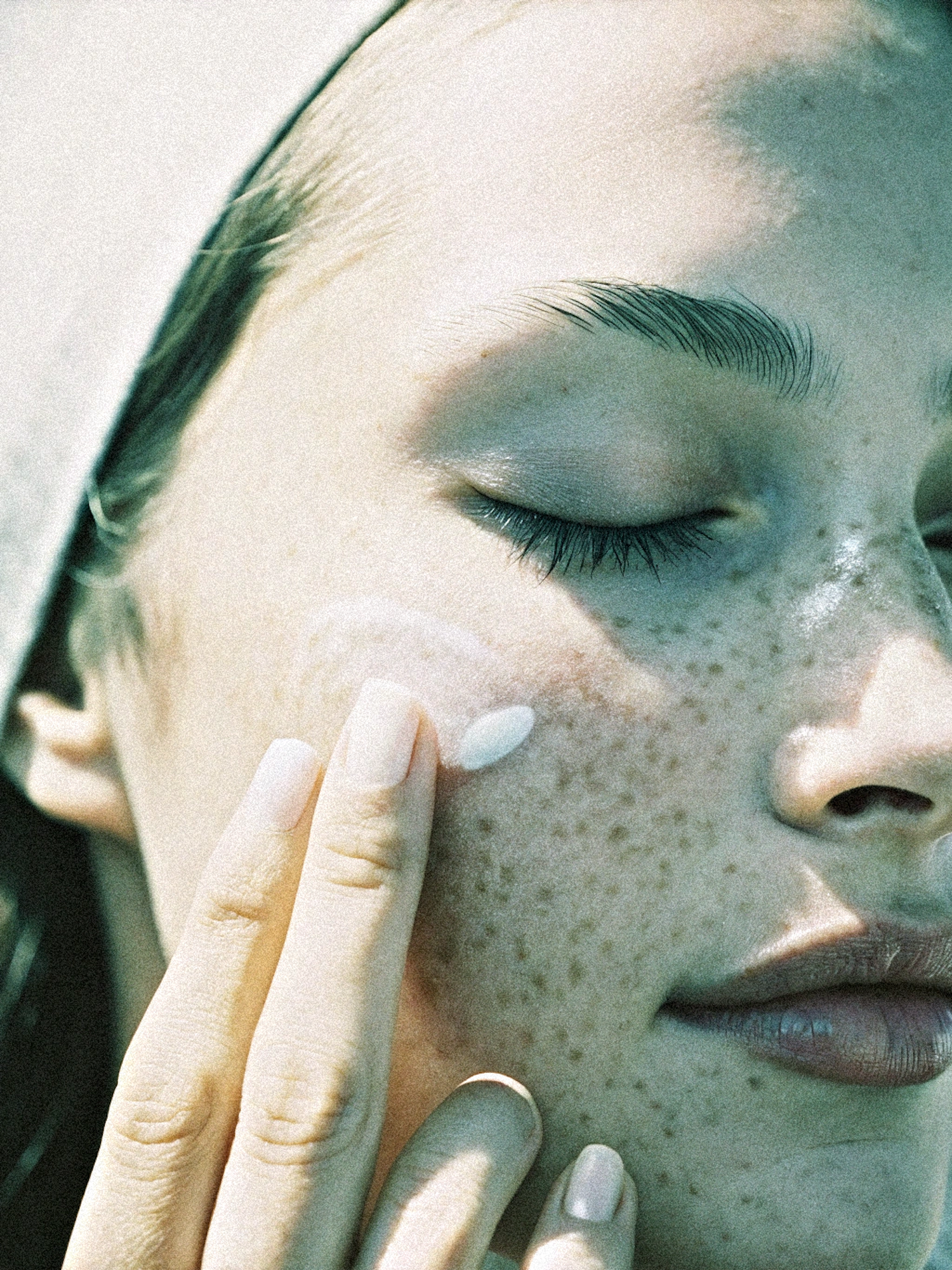 Close-up of a person with freckles applying cream to their cheek, showcasing skincare and natural beauty in soft lighting.