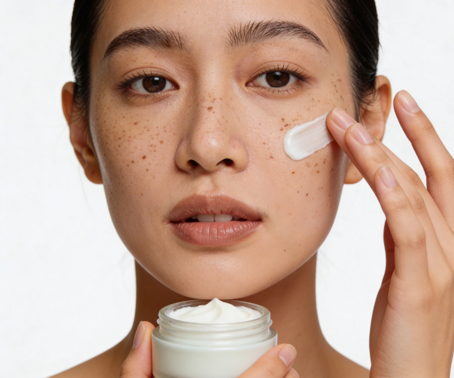 Close-up of a person applying cream to their cheek, holding a jar of skincare product, with a plain white background.