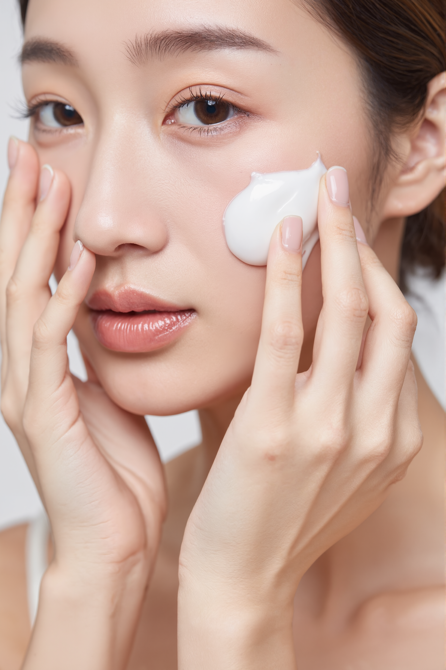 Close-up of a woman applying white cream to her cheek, showcasing smooth skin, glossy lips, and a minimalistic skincare routine.