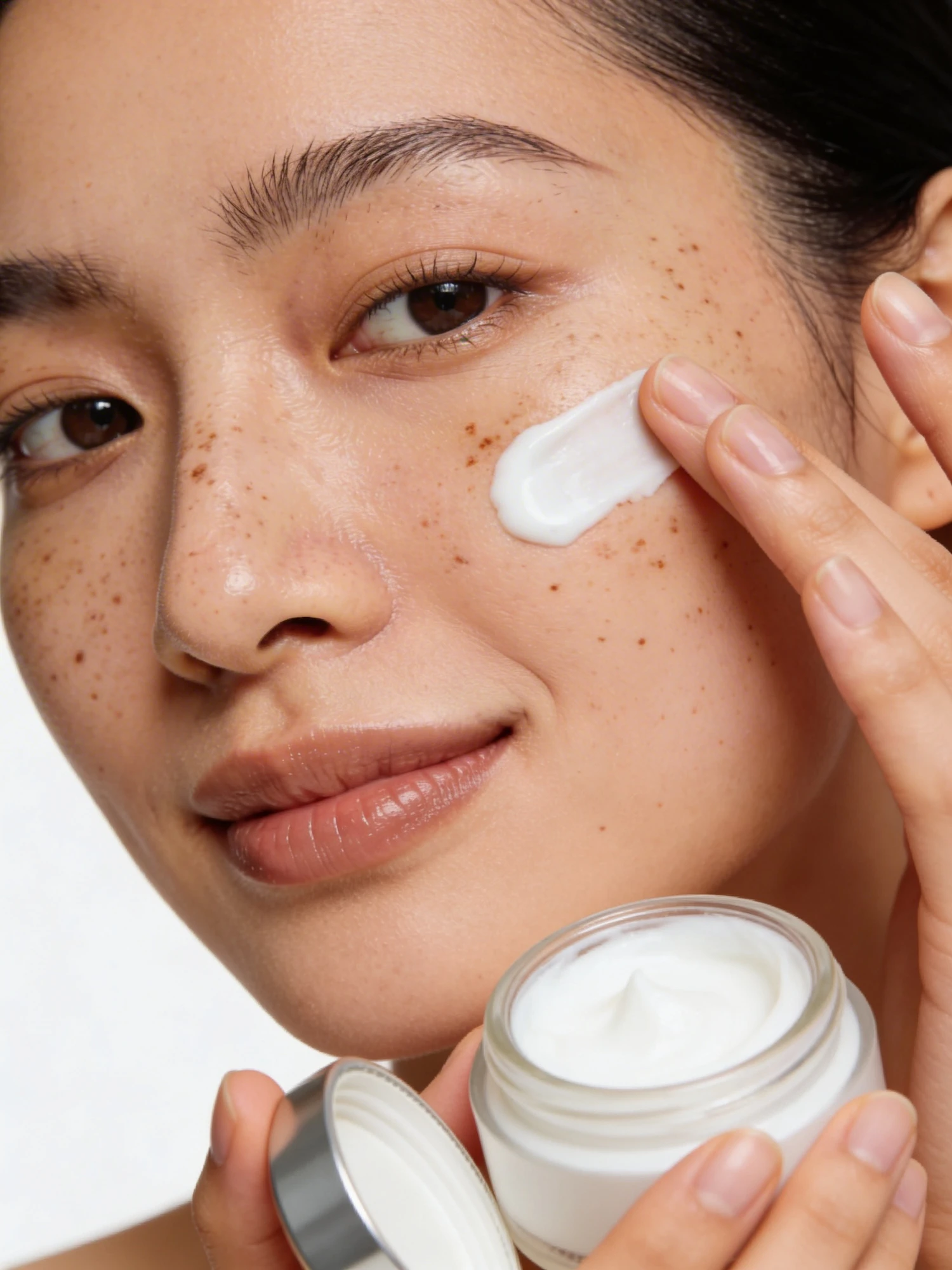 Close-up of a person applying cream to their cheek, showcasing a skincare routine with a focus on natural beauty and healthy skin.