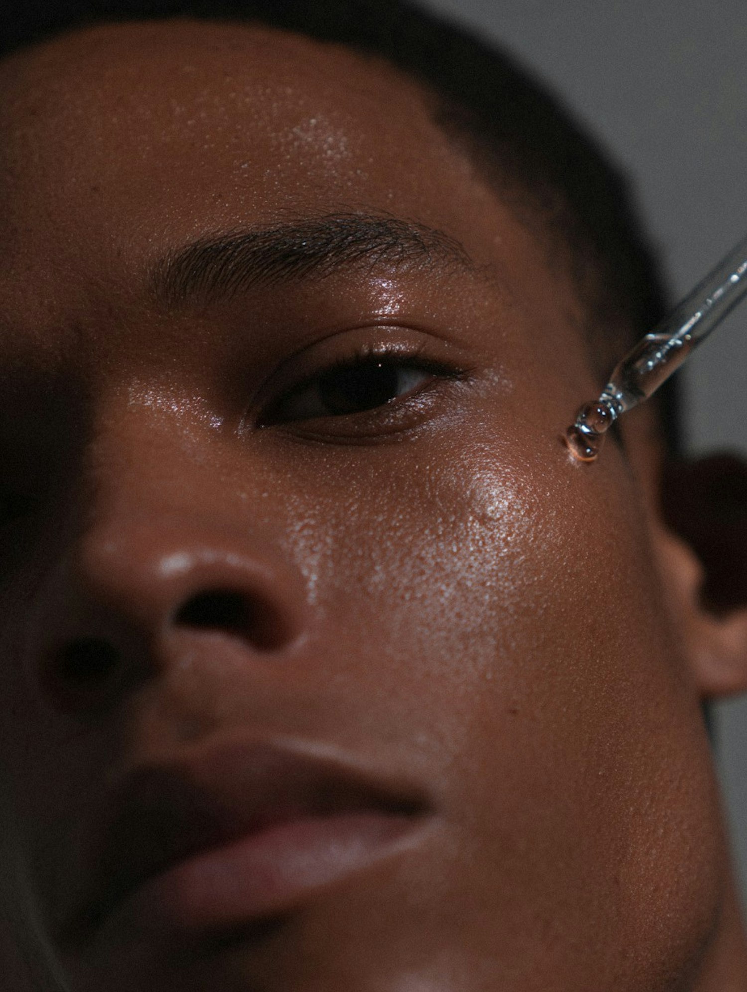 Close-up of a person applying skincare serum with a dropper, highlighting their glowing, hydrated skin and natural texture.