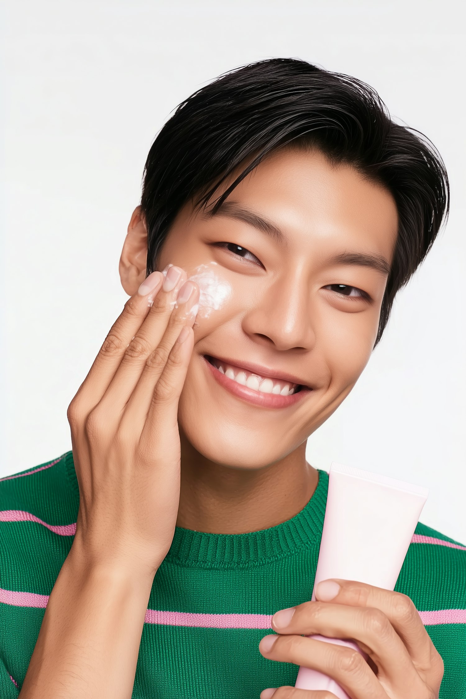 A cheerful individual applies skincare cream, holding a pink tube, wearing a green sweater with pink stripes, against a white background.